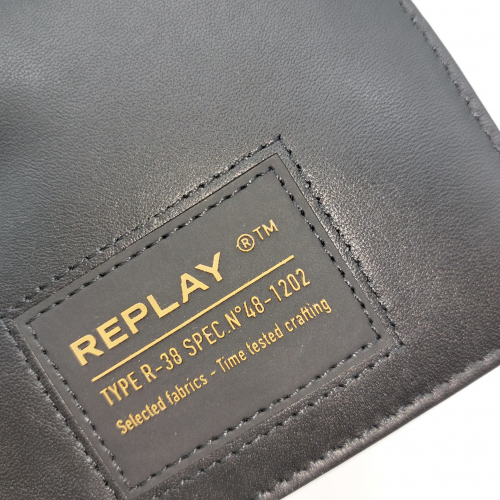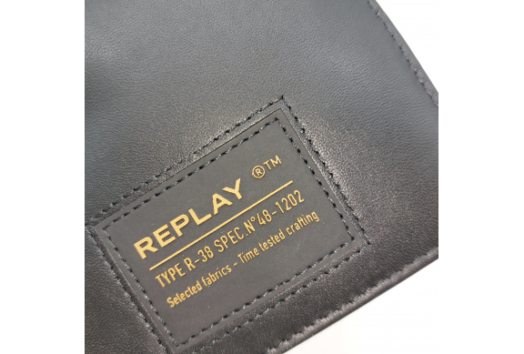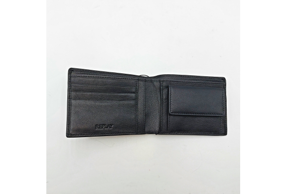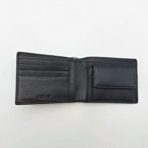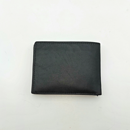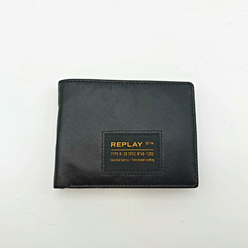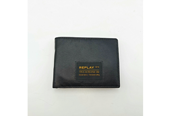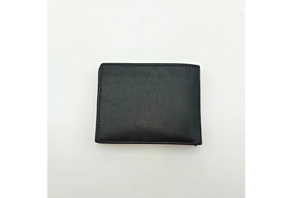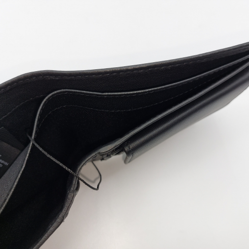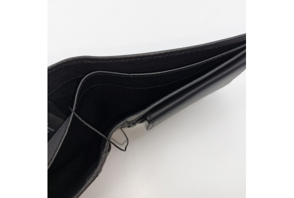 Portafogli in pelle nera con logo stampato, dodici carte, quattro taschine e separatore di banconote.