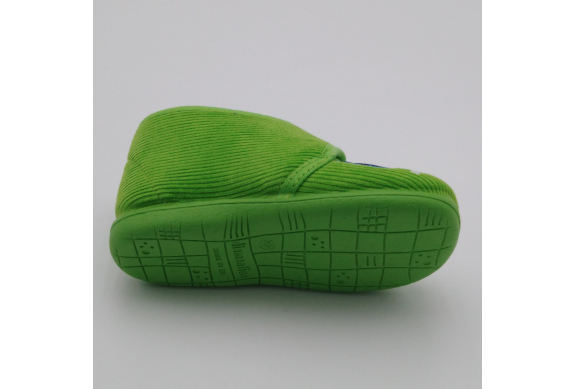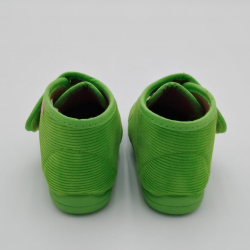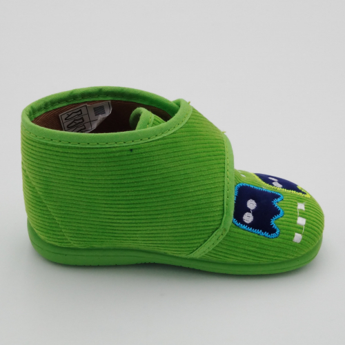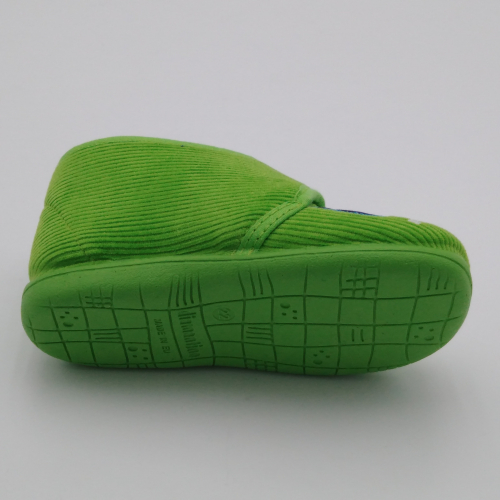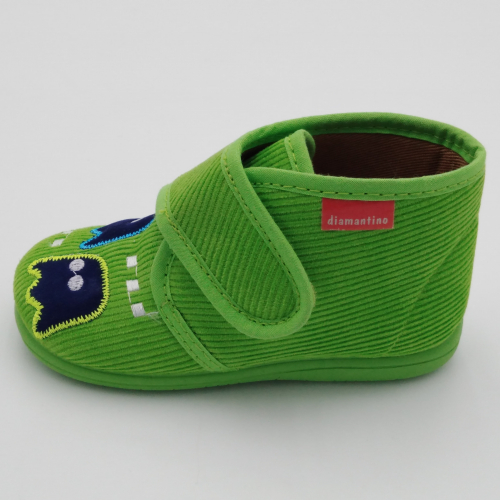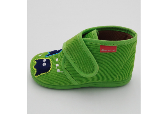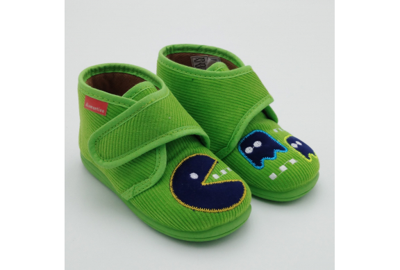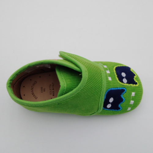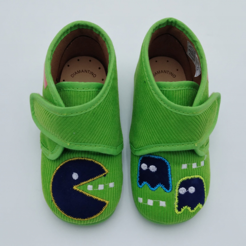 Diamantino presenta questa pantofolina primi passi con pratica e veloce chiusura a strappo, perfetta per tenere al caldo i piedini dei bimbi. Viene realizzata in velluto verde pistacchio con Pac Man ricamato, foderata in cotone, sottopiede estraibile in cuoio e suola in morbida gomma antiscivolo. Tallone posteriore rinforzato e alla giusta altezza per proteggere le caviglie e dare stabilità alla camminata. Ideali per le giornate all'asilo o dai nonni.