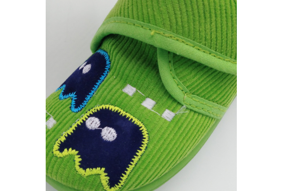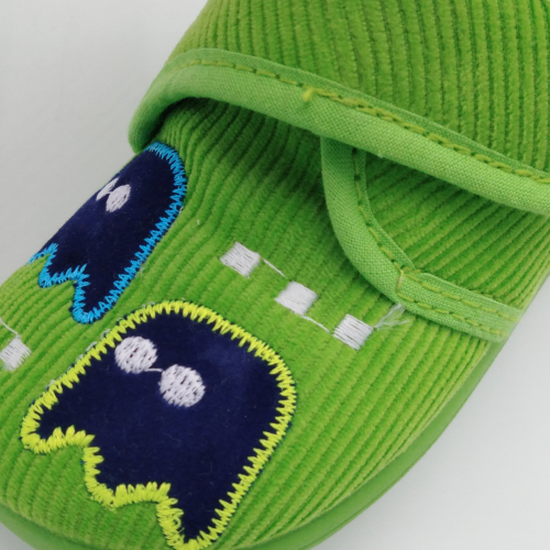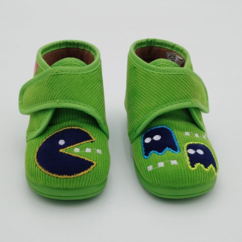 Pantofolina primi passi realizzata in velluto verde con Pac Man ricamato, fodera cotone, sottopiede estraibile in cuoio e suola in morbida gomma.