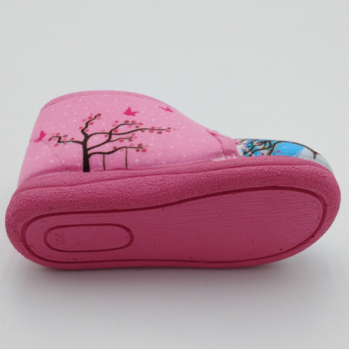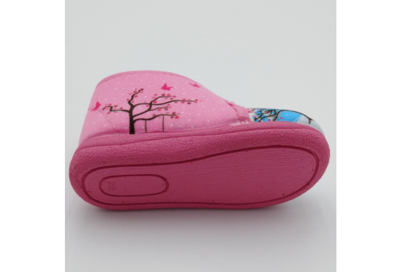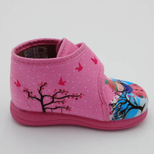 Pantofolina primi passi realizzata in panno rosa con bambolina stampata, fodera cotone, sottopiede estraibile in cuoio e suola in morbida gomma.