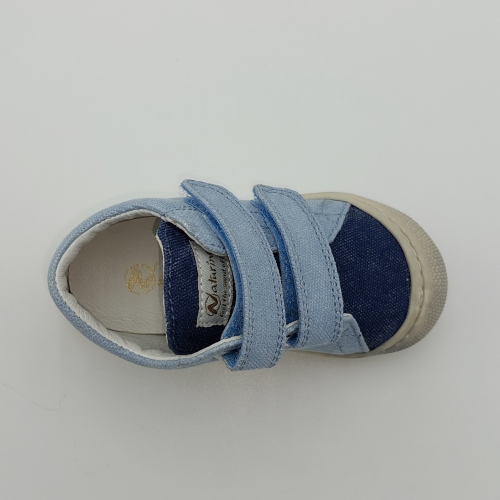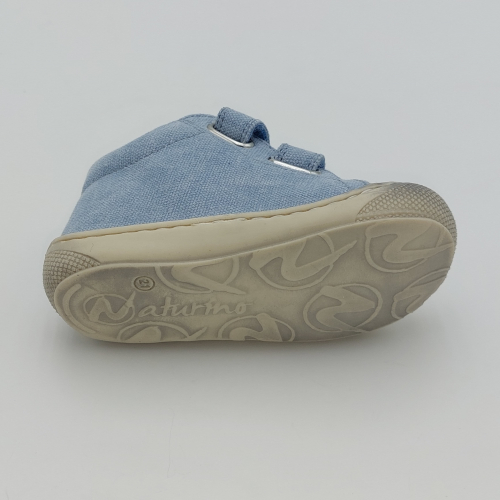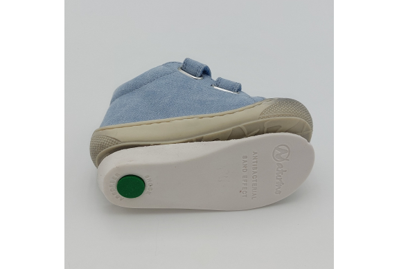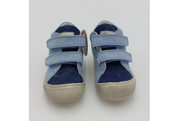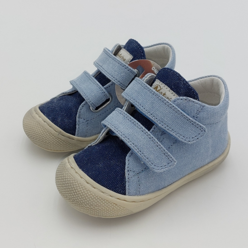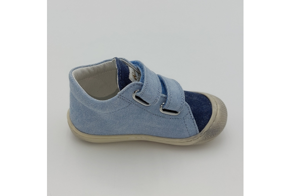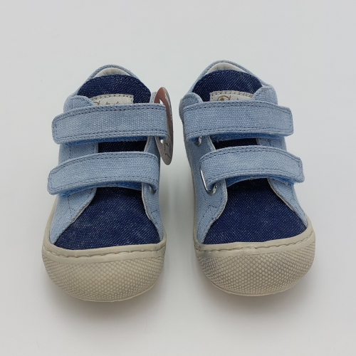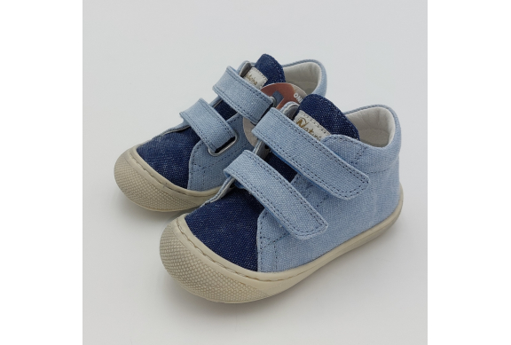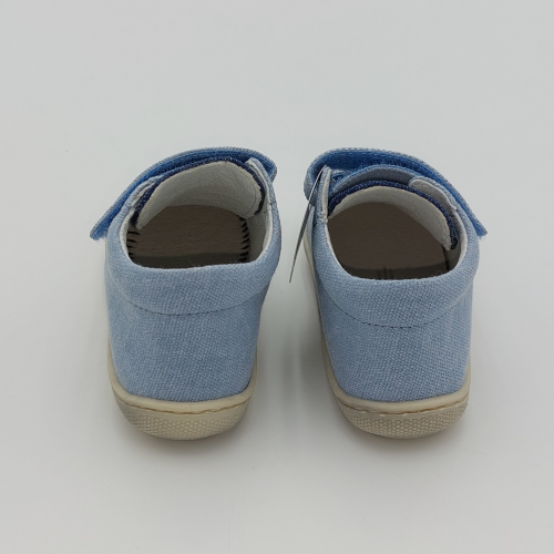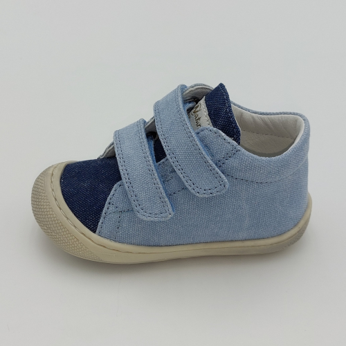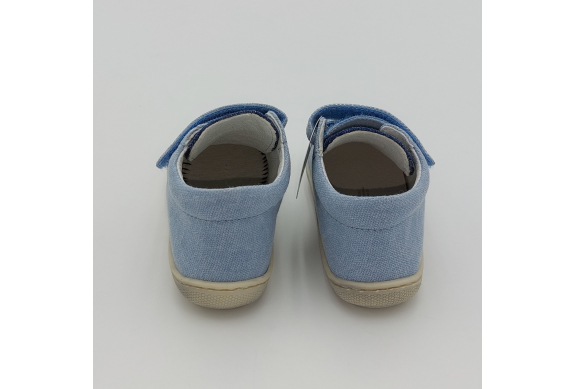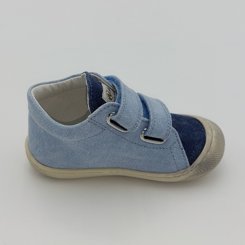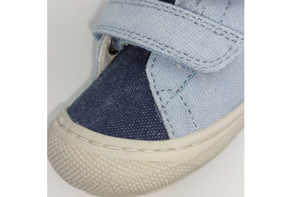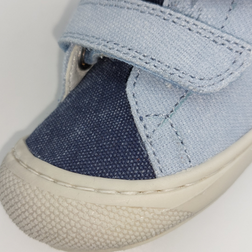 Primi passi in tela celeste e blu. Chiusura con strappo per una facile calzata. Tomaia in canvas, fodera pelle e plantare anatomico "effetto sabbia" con suola in gomma cucita alla tomaia.