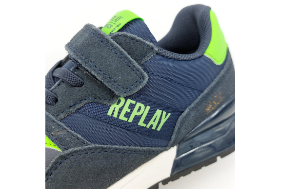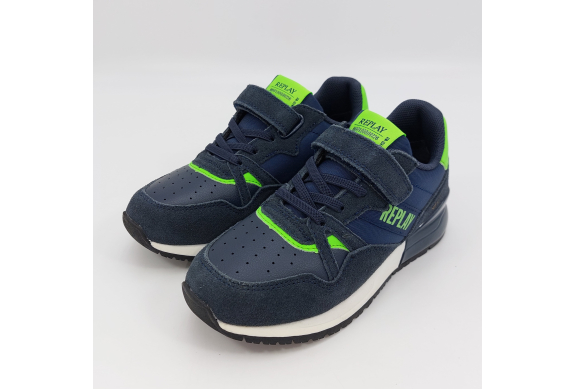 Scarpa sportiva Replay Shoot Jr 1 blu e verde fluo, in camoscio e tessuto, con lacci elastici e chiusura a strappo. Suola in stile retrò per un look sportivo e casual al tempo stesso, facile e veloce da indossare adatta a svariate occasioni.