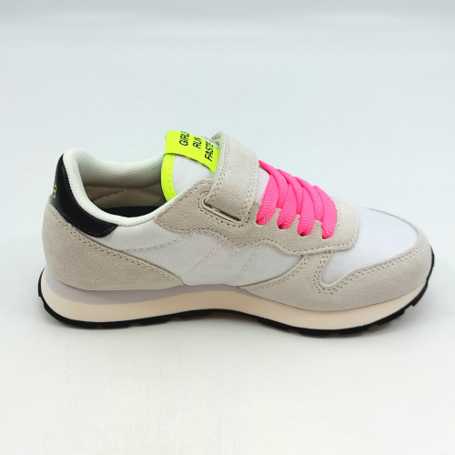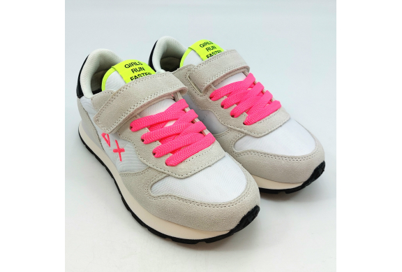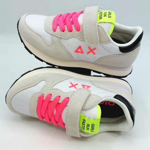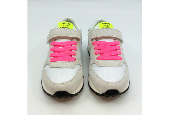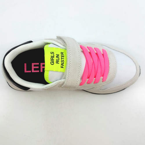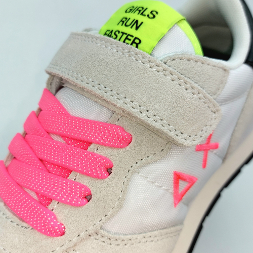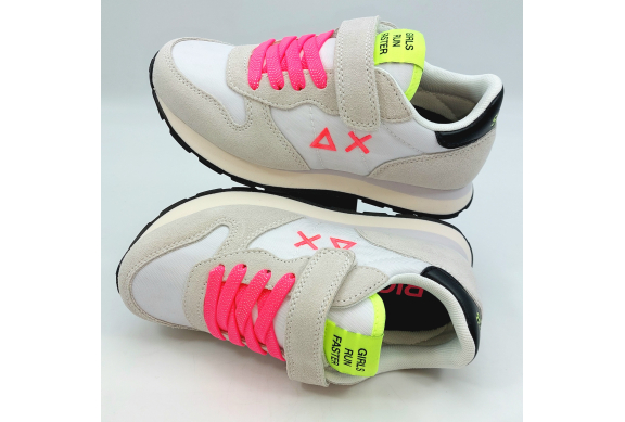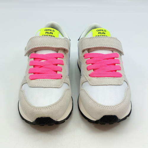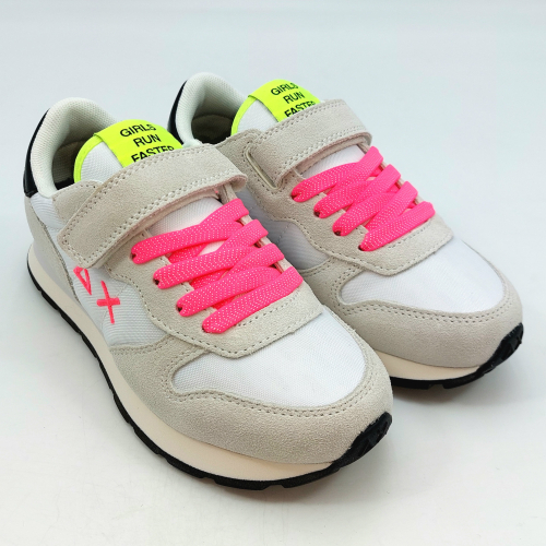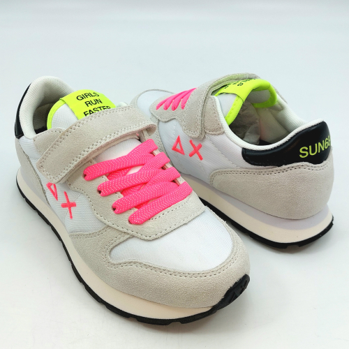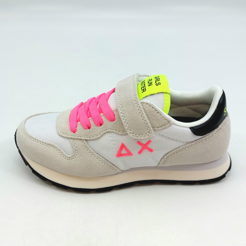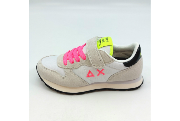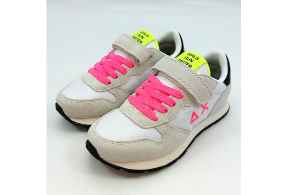Le Sun 68 Ally Solid Nylon sono sneaker bambina con lacci elastici e strappo regolabile, facile e veloce da calzare. Tomaia in pelle scamosciata e nylon bianco con dettagli fuxia. Interno e plantare anatomico estraibile in tessuto. Collarino imbottito, suola in gomma naturale logata , intersuola in eva, patch nero sul tallone. Comode e leggere, sono scarpe che donano comfort al piede e sono perfette per uso quotidiano dalla scuola al parco giochi.