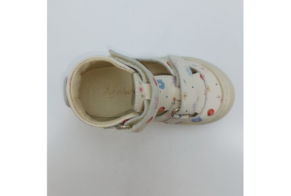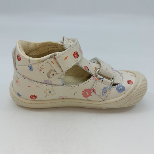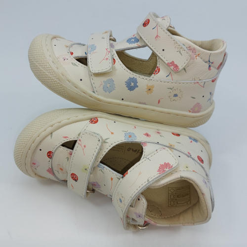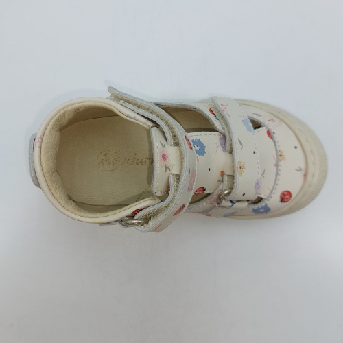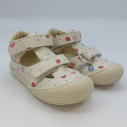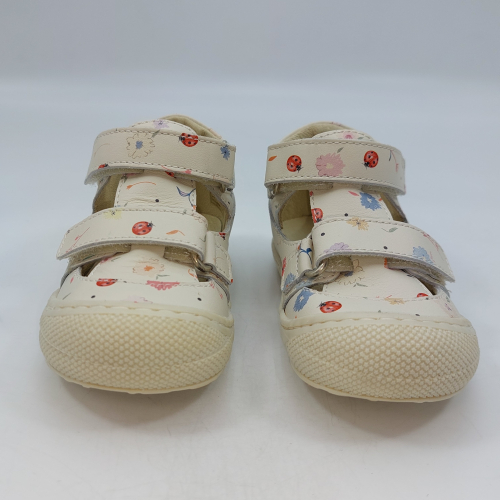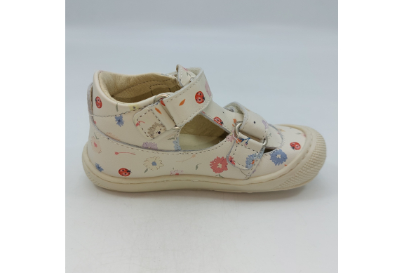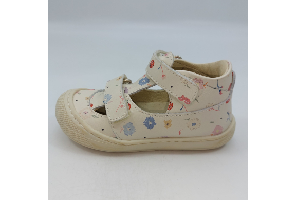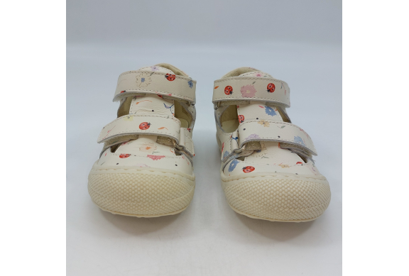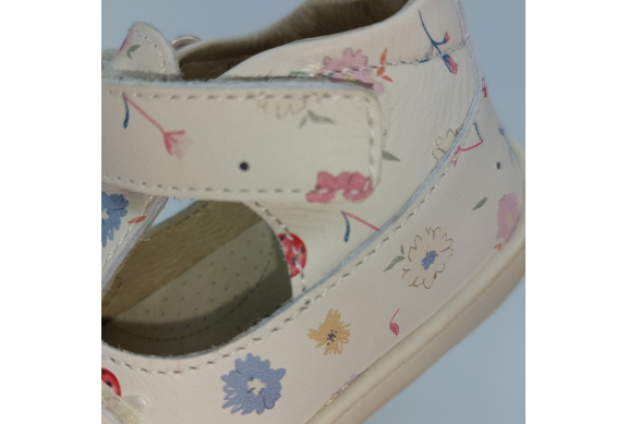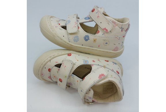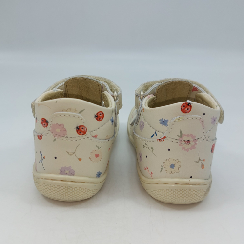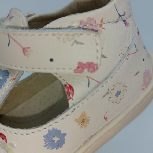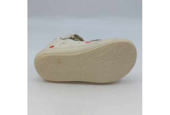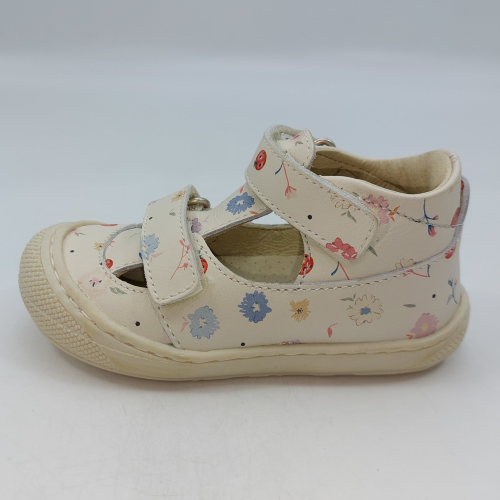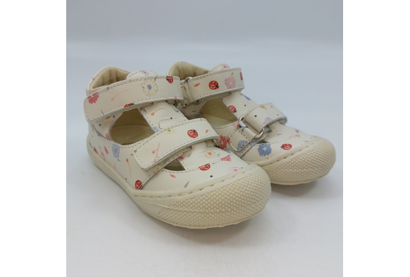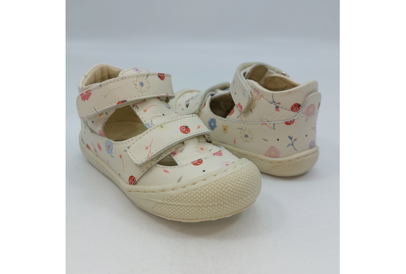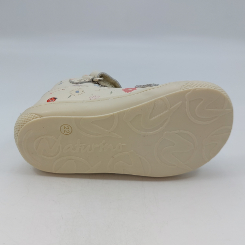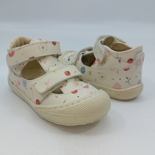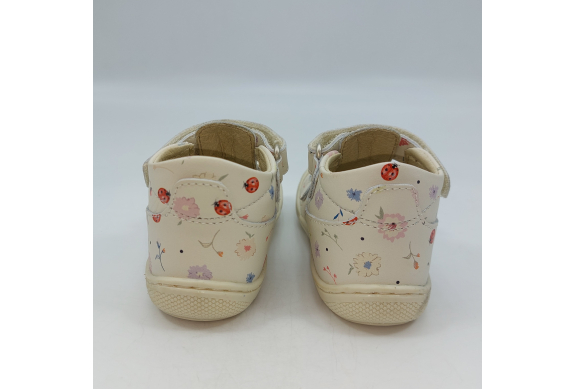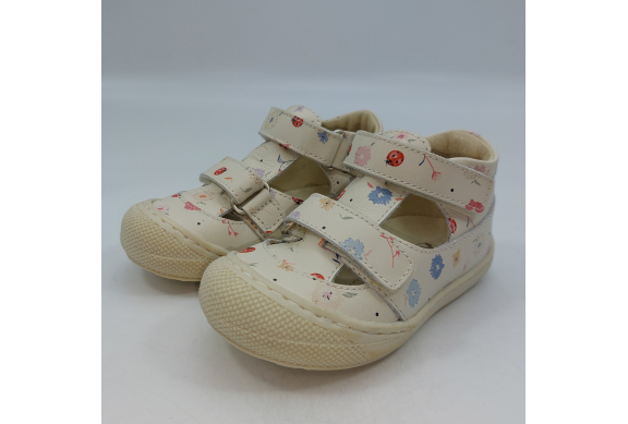 Il Naturino Puffy è un sandalo primi passi semi aperto, pensato per i bambini che gattonano einiziano a comminare. La tomaia è realizzata in una morbida nappa bianco latte con fantasia floreale, la chiusura è con due strappi per una perfetta regolazione. La tomaia in nappa rende il modello particolarmente comodo e permette di aderire come un guanto ai piedini dei bimbi, che appoggiano su un plantare anatomico in pelle con antishock, antibatterico e effetto sabbia. La suola è in una gomma antiscivolo, leggera e flessibile cucita alla tomaia. La punta è rinforzata per aiutare i bambini a muovere i loro primi passi senza alcuna difficoltà.