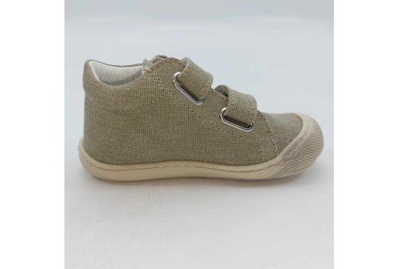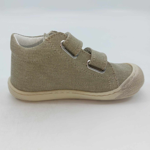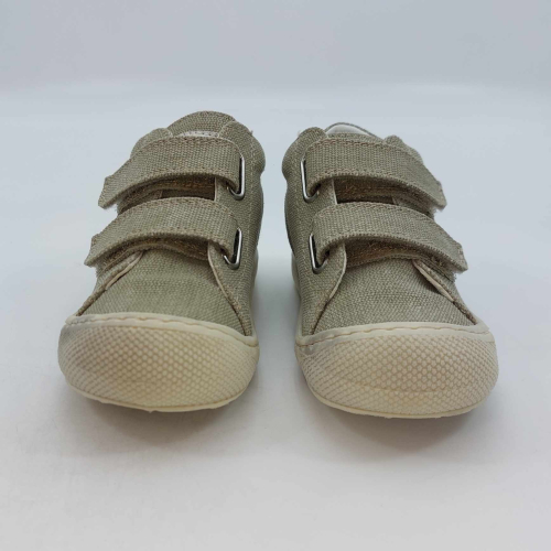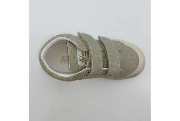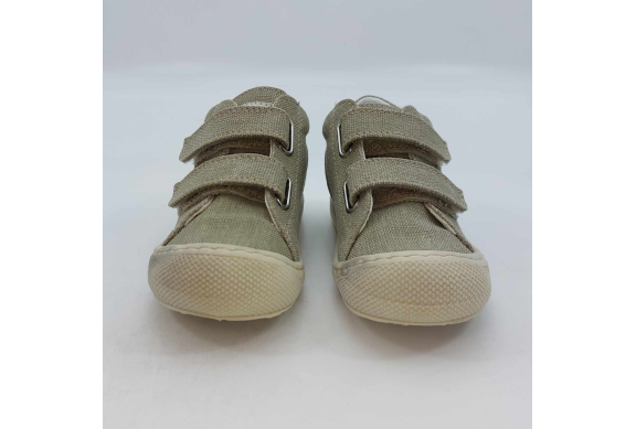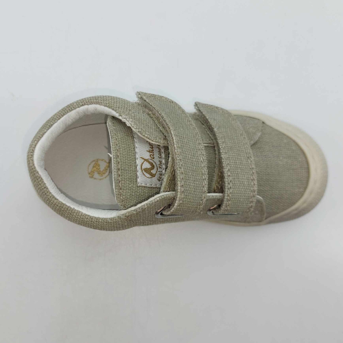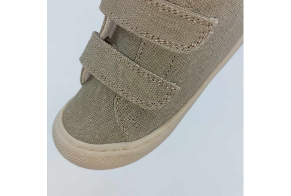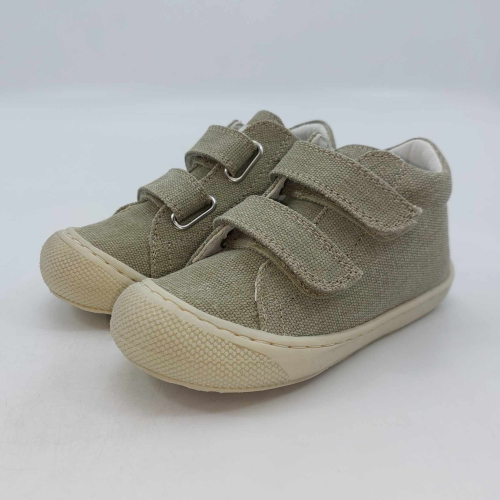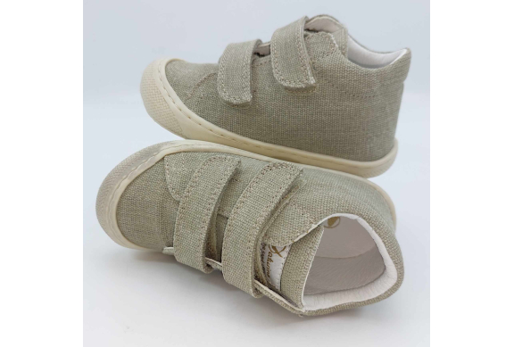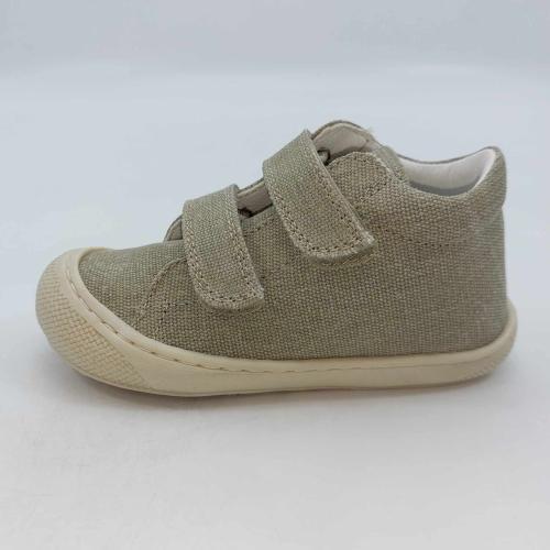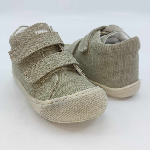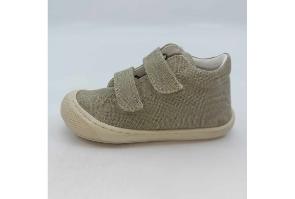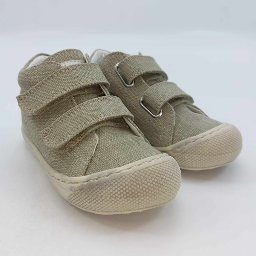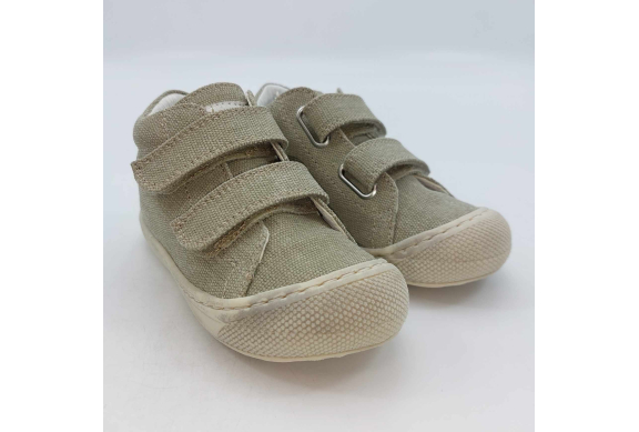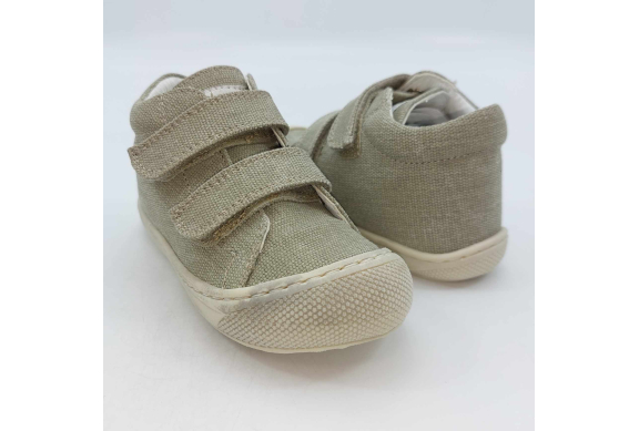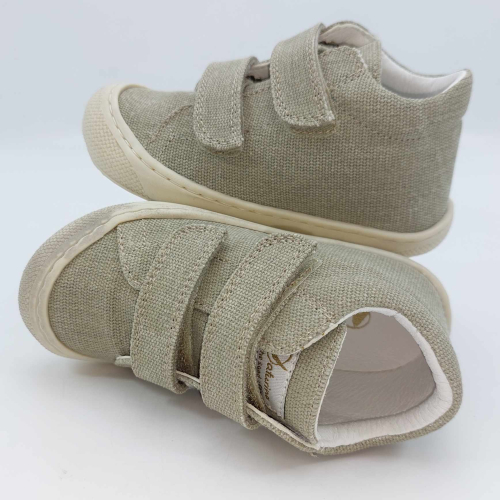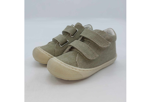 Primi passi in morbida tela verde salvia. Chiusura con strappo per una facile calzata. Tomaia in canvas, fodera pelle e plantare anatomico "effetto sabbia" con suola in gomma cucita alla tomaia.