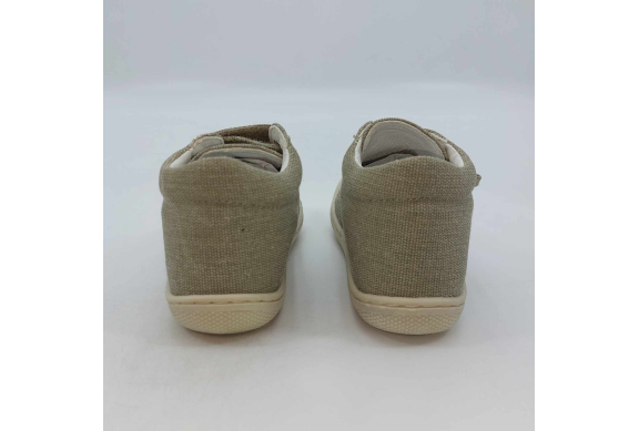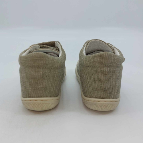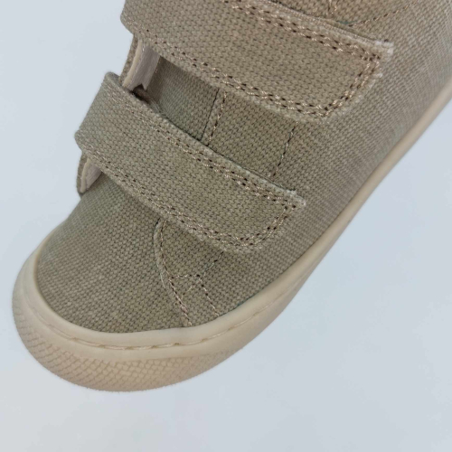 Primi passi in tela beige e jeans. Chiusura con strappo per una facile calzata. Tomaia in canvas, fodera pelle e plantare anatomico "effetto...