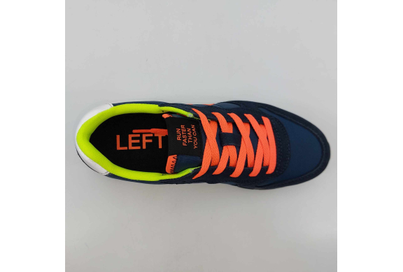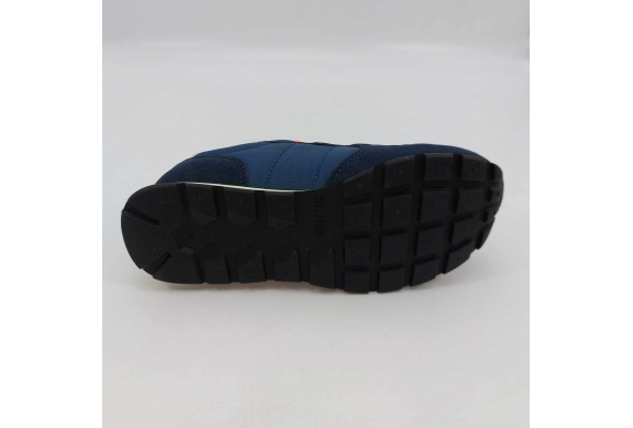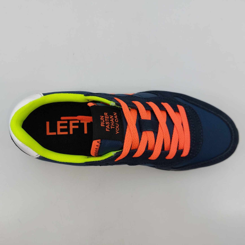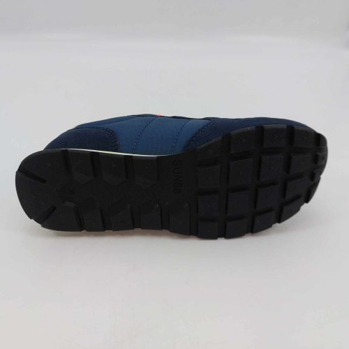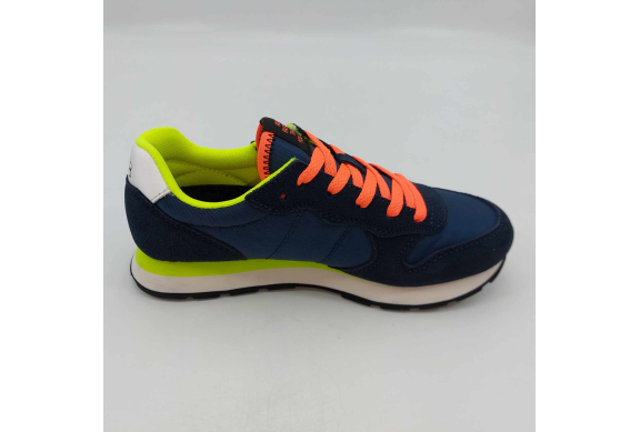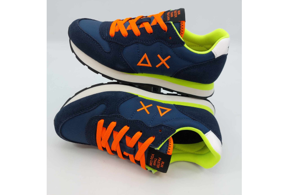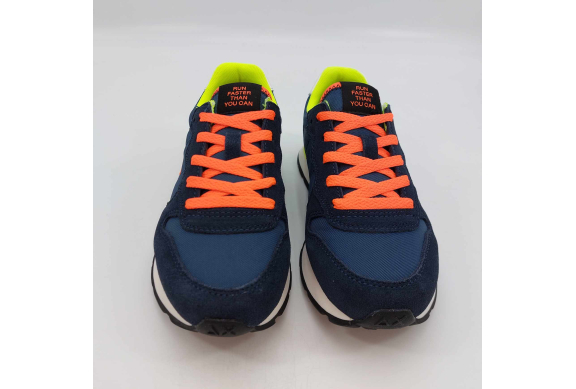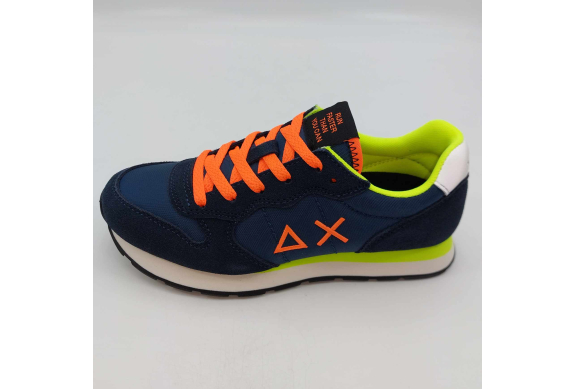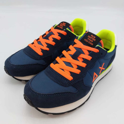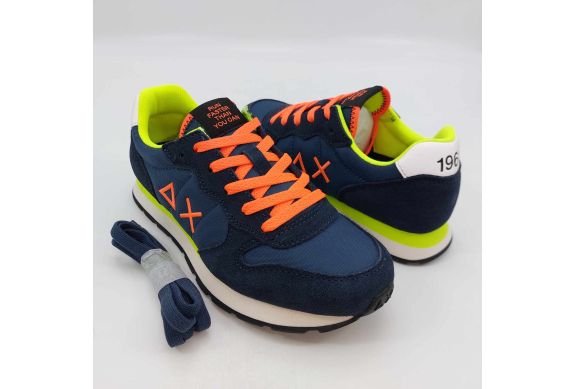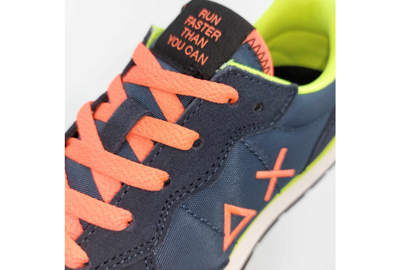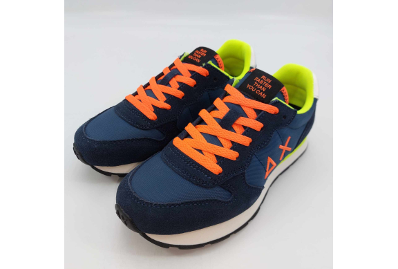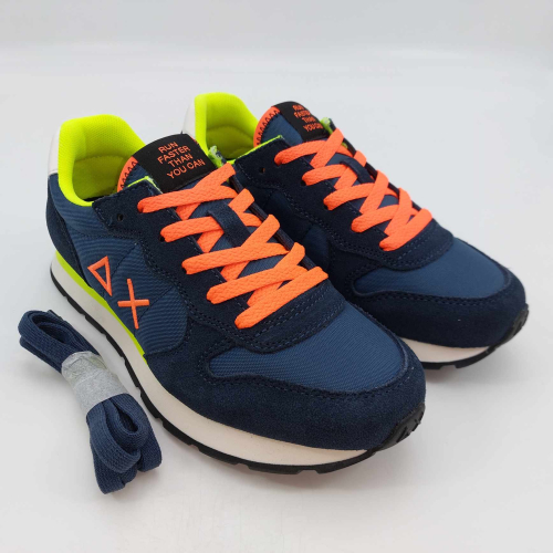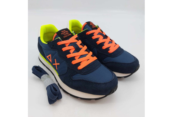 Le Sun 68 Tom Fluo sono sneaker junior con lacci cinque fori, doppi lacci elastici in dotazione per trasformarle in una slip on facile e veloce da calzare. Tomaia in pelle scamosciata e nylon blue navy con dettagli fluo. Interno e plantare in tessuto. Collarino imbottito, suola in gomma naturale logata, intersuola in eva, patch in pelle sul tallone. Comode e leggere, hanno un design ispirato agli anni '90 e rivisitato in chiave attuale. Sono scarpe che donano comfort al piede e al look una linea moderna. Adatte per uso quotidiano ma anche per occasioni importanti.
