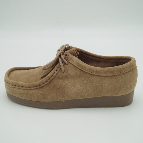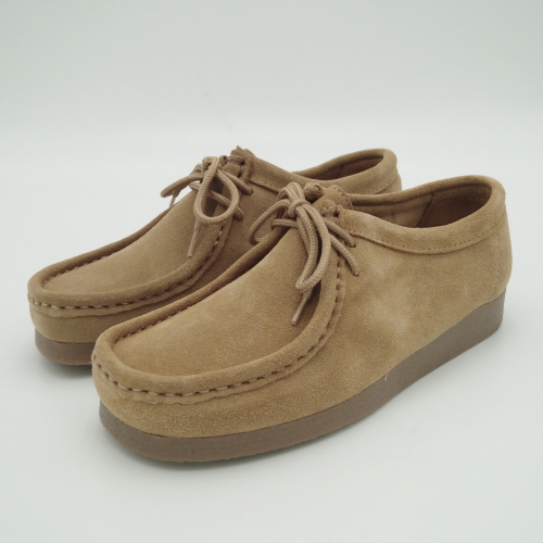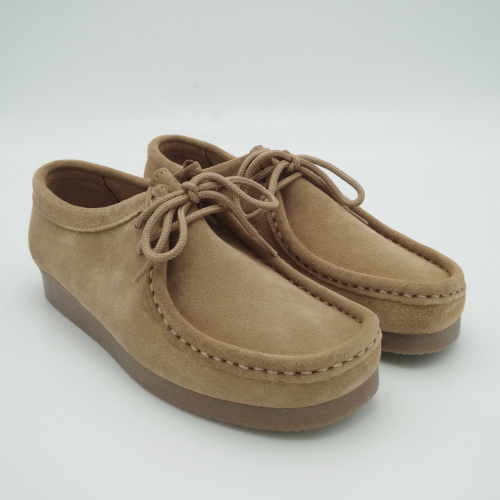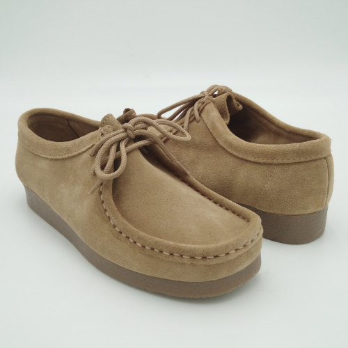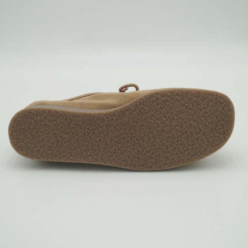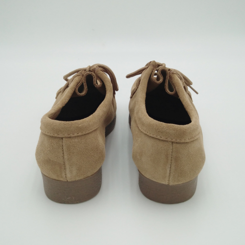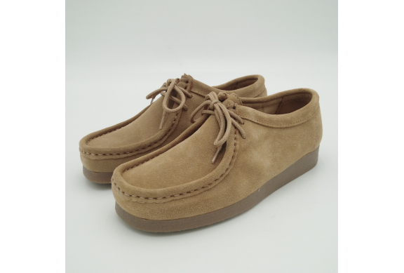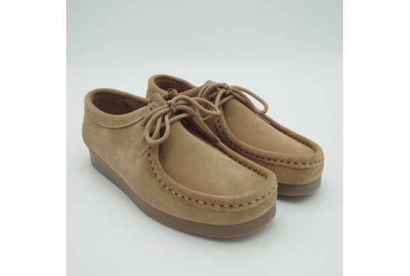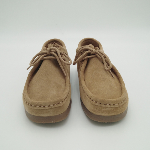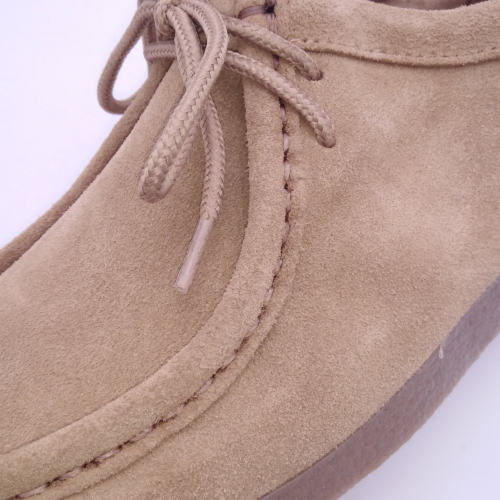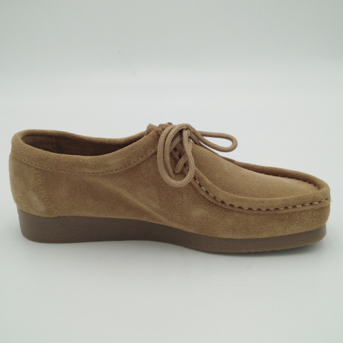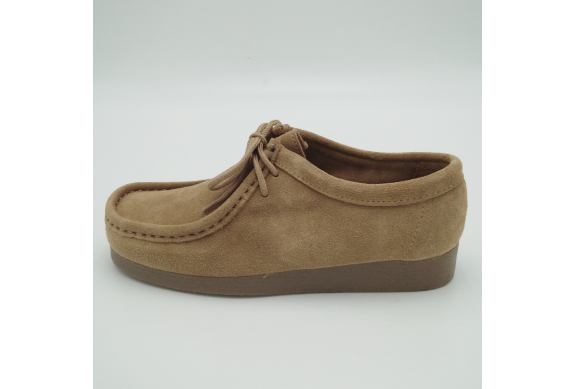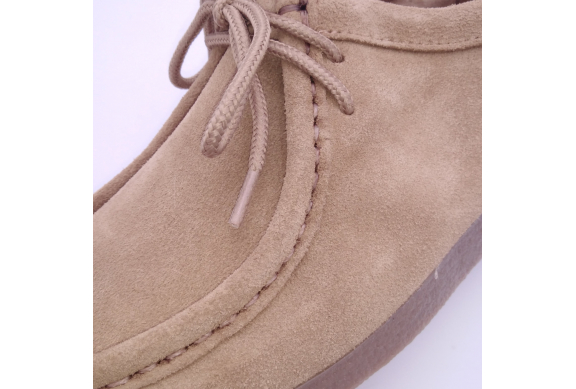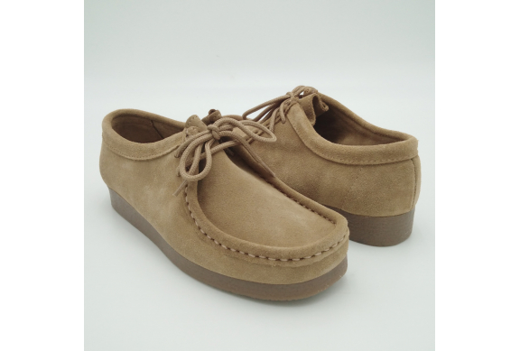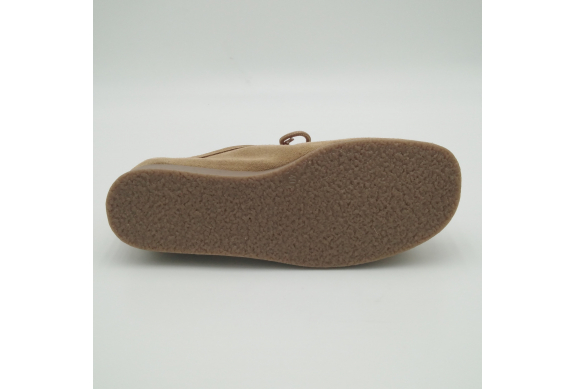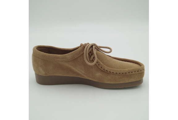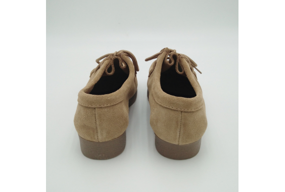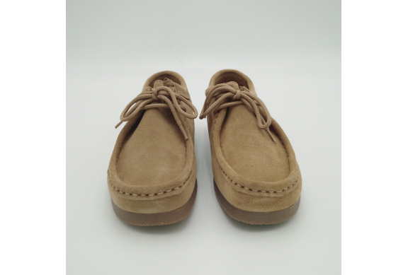 Mocassino allacciato semplice e lineare. Cucito a mano e ispirato alle calzature degli indiani d'America. Costruito in pelle scamosciata, sfoderato e suola in gomma.