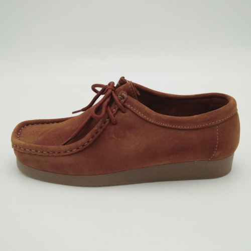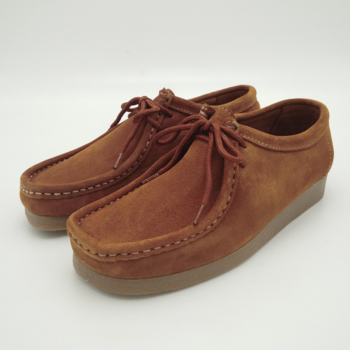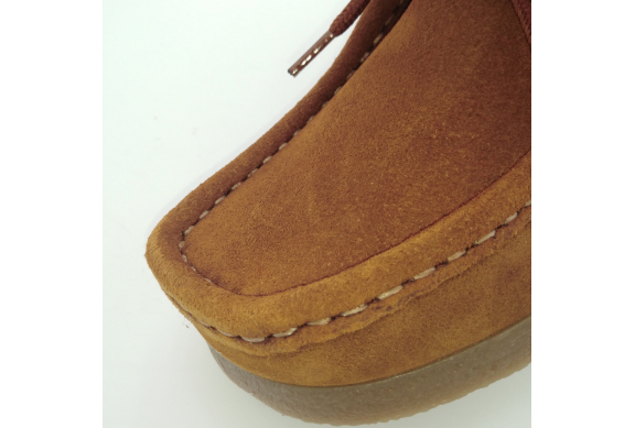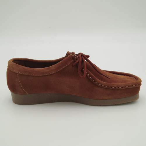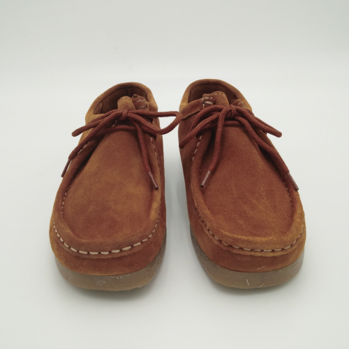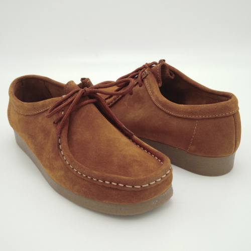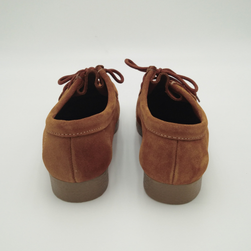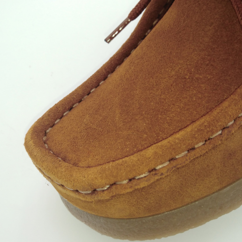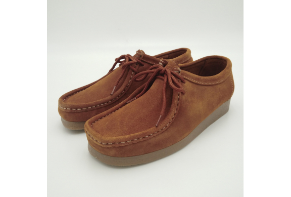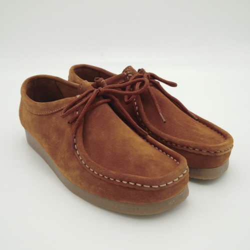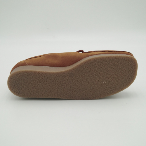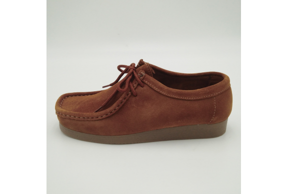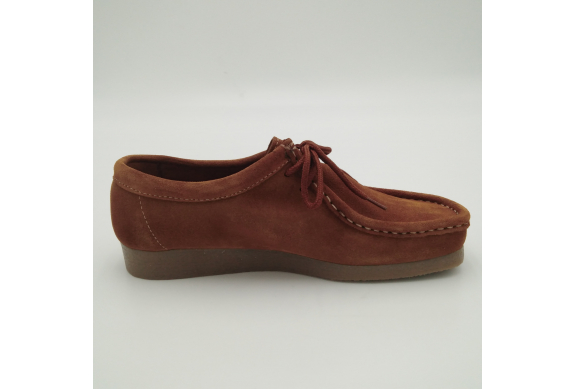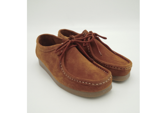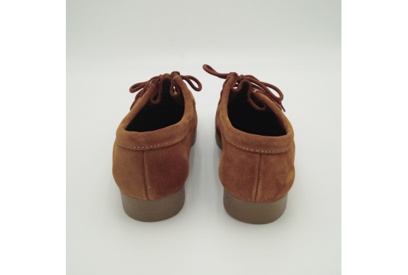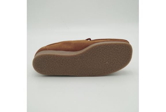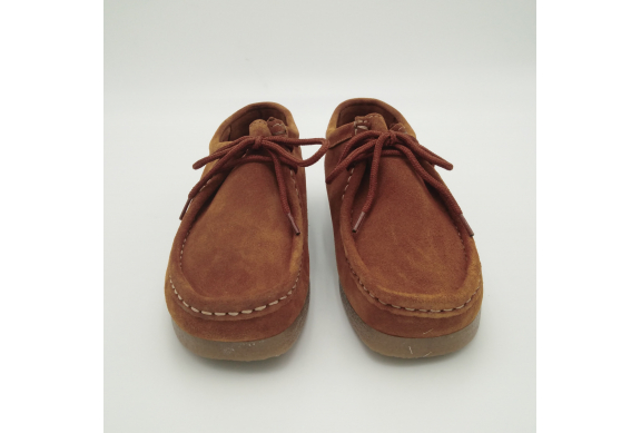 Mocassino allacciato semplice e lineare. Cucito a mano e ispirato alle calzature degli indiani d'America. Costruito in pelle scamosciata, sfoderato e suola in gomma.