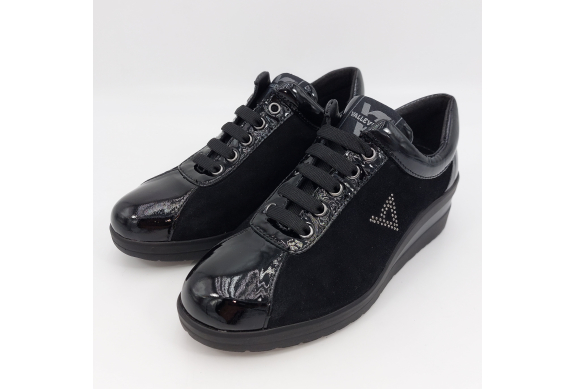 Valleverde presenta questa scarpa in morbido camoscio e pelle lucida nera con dettaglio di strass. Chiusura con lacci cinque fori per una calzata regolabile, fodera in tessuto, plantare anatomico estraibile in pelle. Zeppa alta 5 scende a 1,5 cm. Suola in gomma, ultra leggera e flessibile.