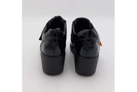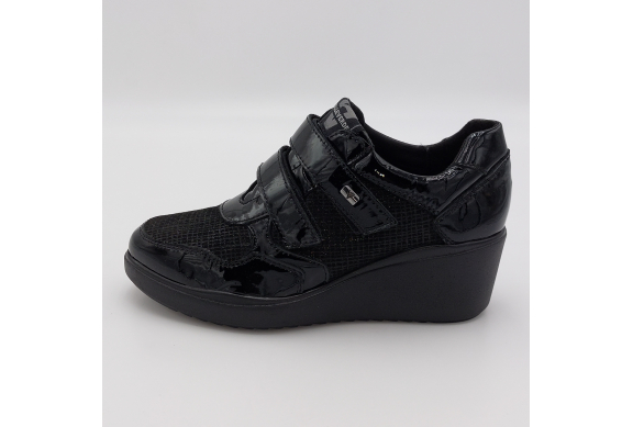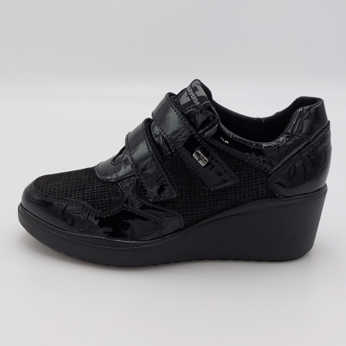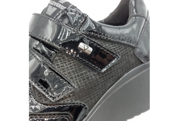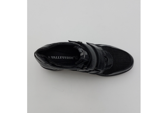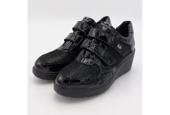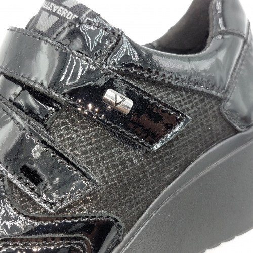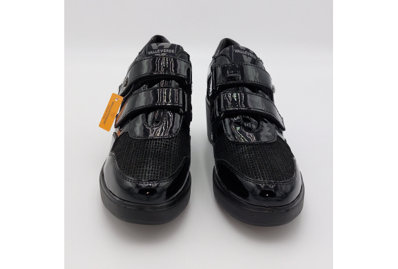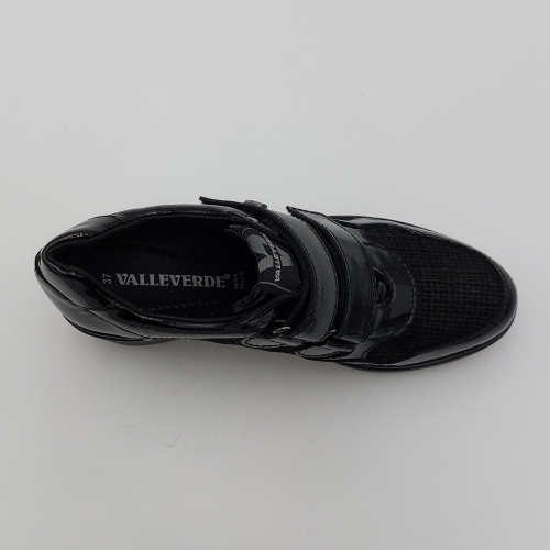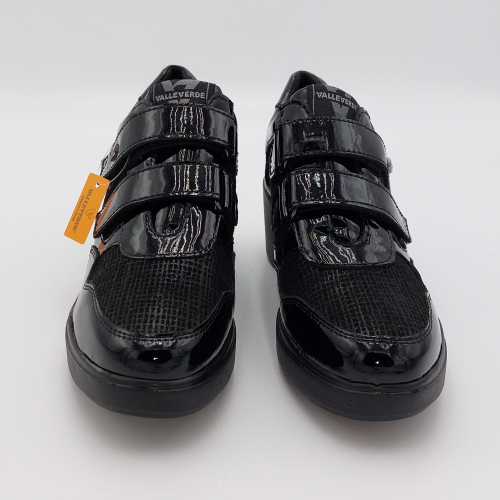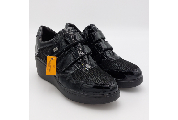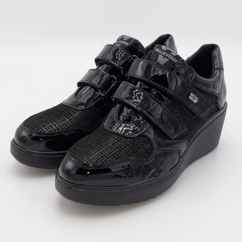 Valleverde presenta questa scarpa in pelle lucida e laminata nera. Pratica chiusura con strappi per una calzata facile e veloce, fodera in tessuto, plantare anatomico estraibile in pelle. Zeppa alta 6 scende a 2 cm. Suola in gomma, leggera e flessibile.