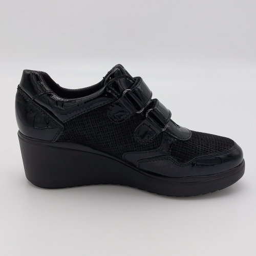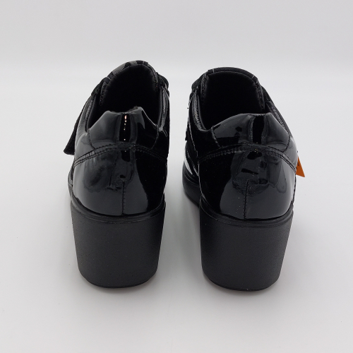 Scarpa Valleverde in pelle lucida e laminata, calzata comoda, chiusura con strappi, plantare anatomico estraibile in pelle. Zeppa alta 6 cm.