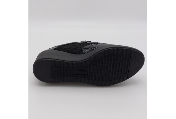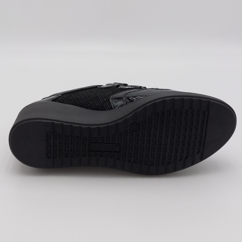 Scarpa in pelle nera, chiusura con lacci e zip laterale, plantare estraibile in pelle con memory foam. Zeppa alta 5,5 cm.