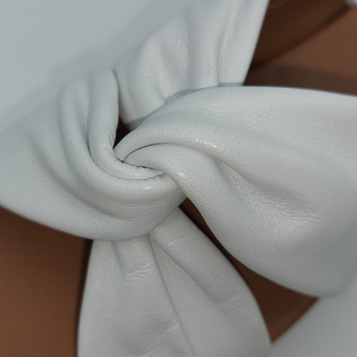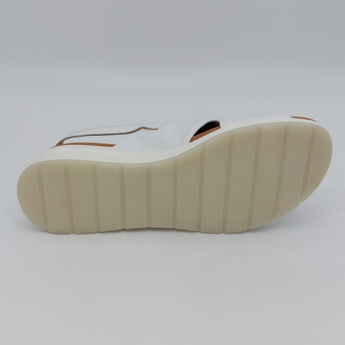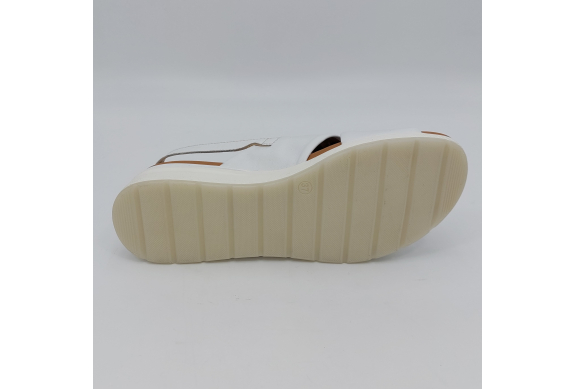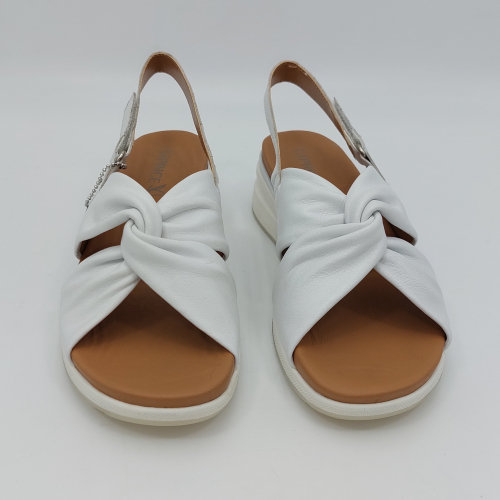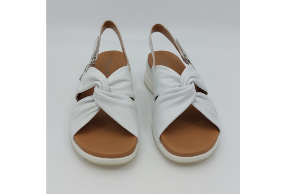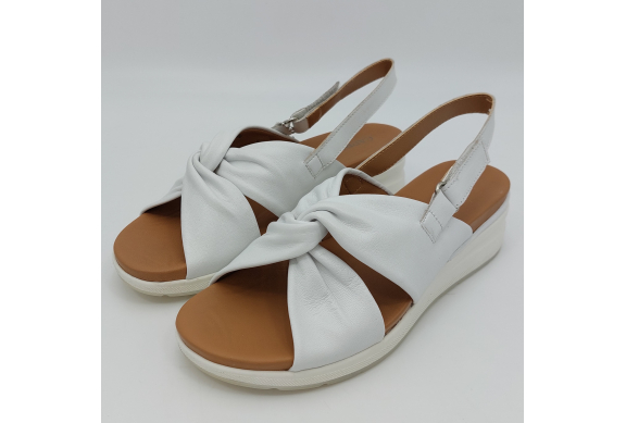 Sandalo incrociato con due fasce in morbida nappa bianca, cinturino sul tallone regolabile con strappo. Fodera e plantare in pelle. Zeppa in gomma alta 5 cm.
