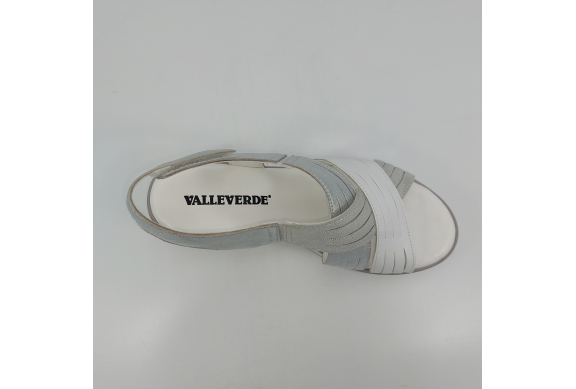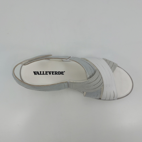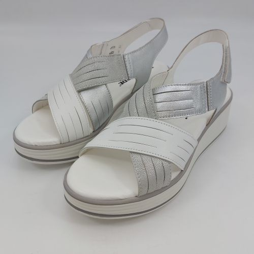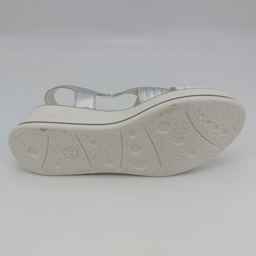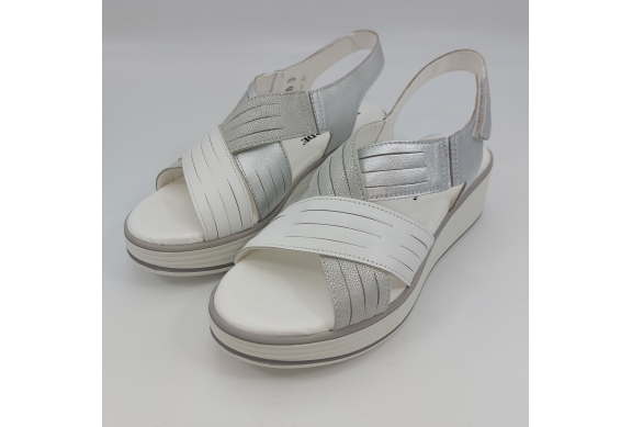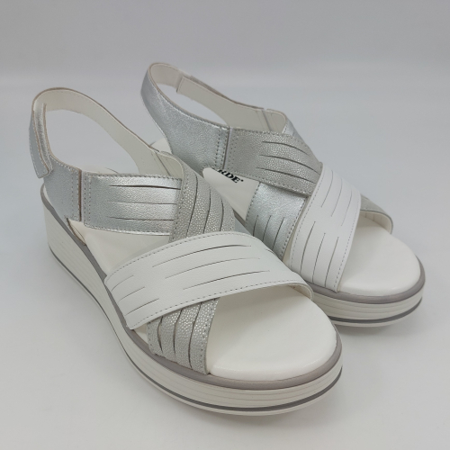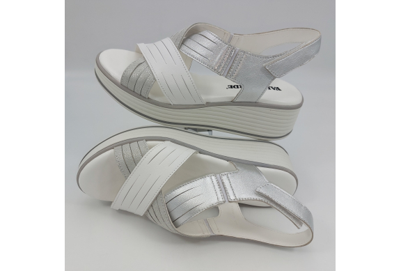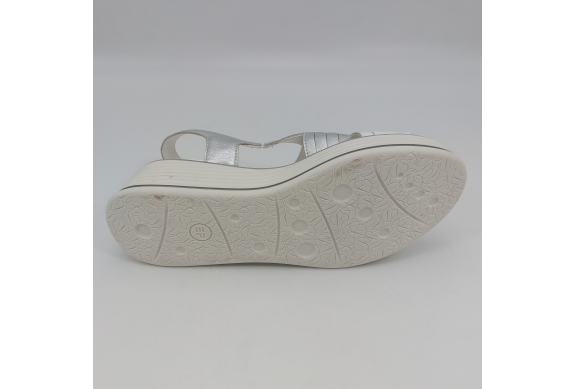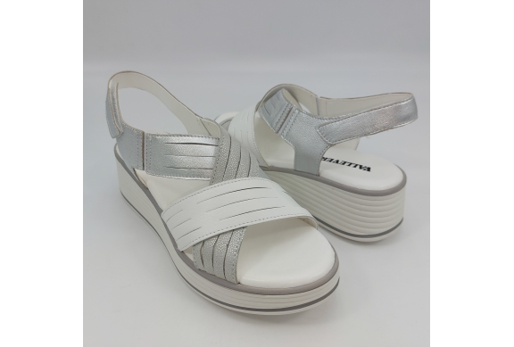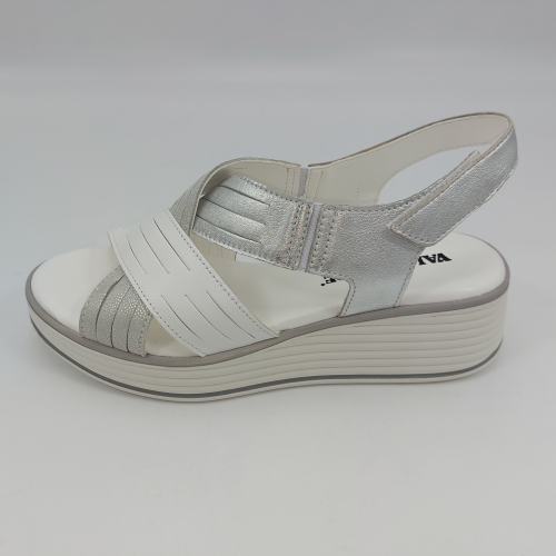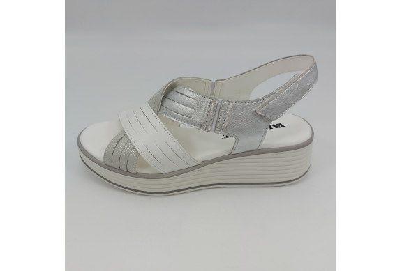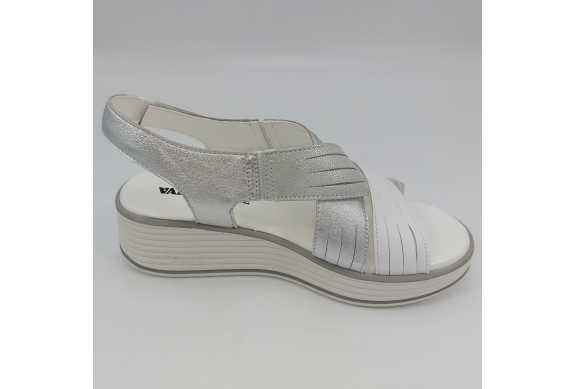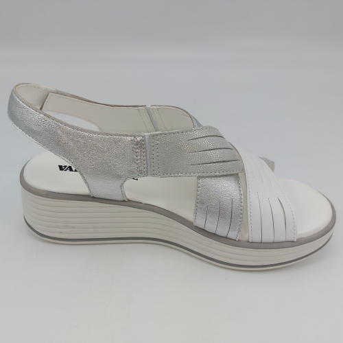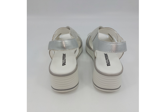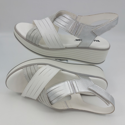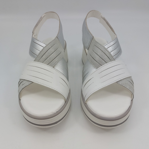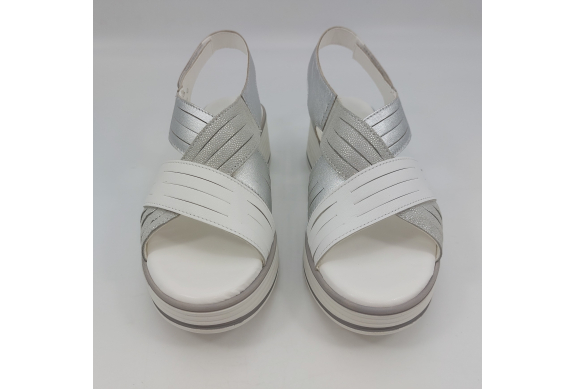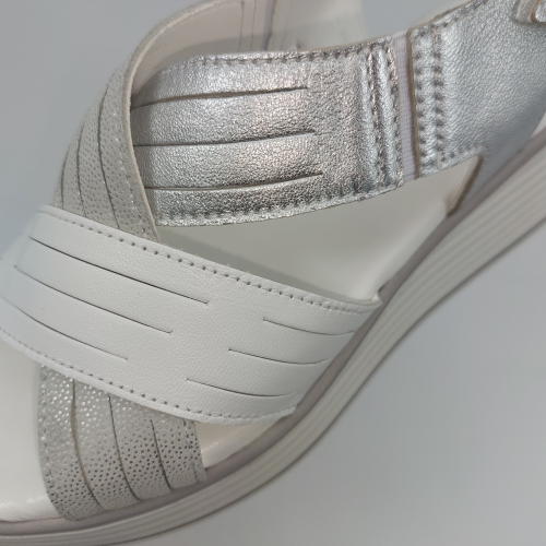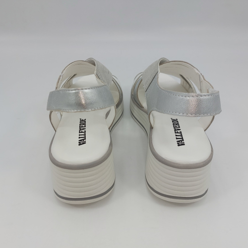 Sandalo con due fasce in morbida nappa platino, cinturino sul tallone e fascia con strappo. Fodera e plantare in pelle. Zeppa in gomma alta 5 cm.