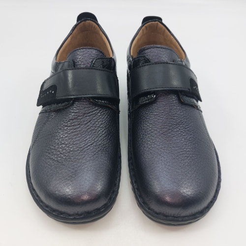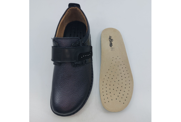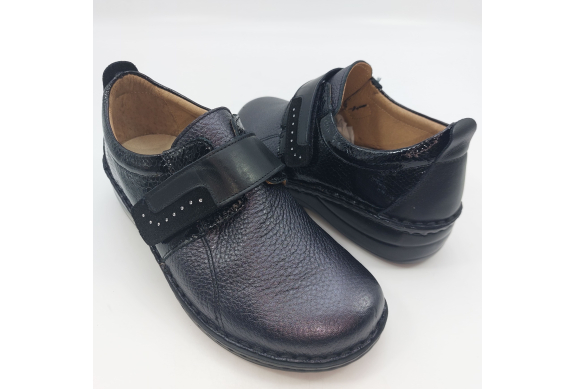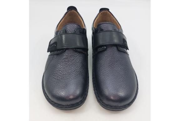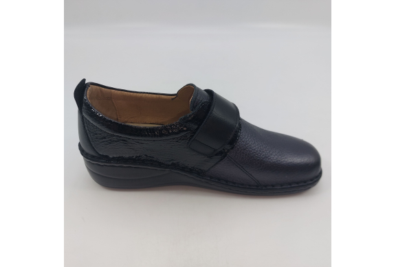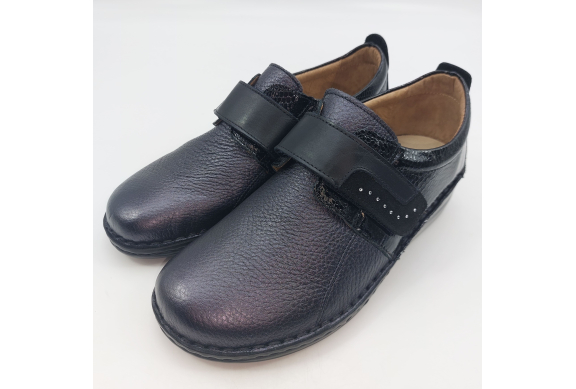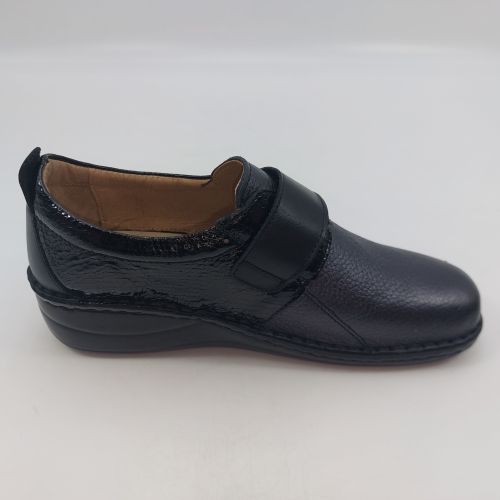 Scarpa in naplack nero e pelle antracite, strappo per favorire una calzata rapida. Predisposta per alloggiare un plantare personale. La suola è in gomma cucita alla tomaia, flessibile e resistente. Plantare anatomico estraibile in pelle scamosciata. Made in Italy