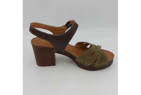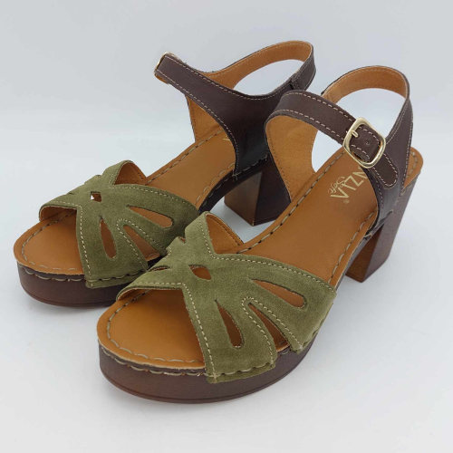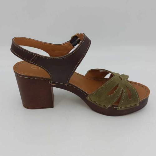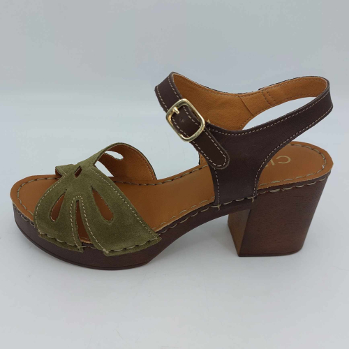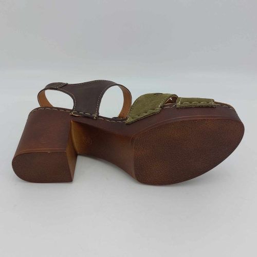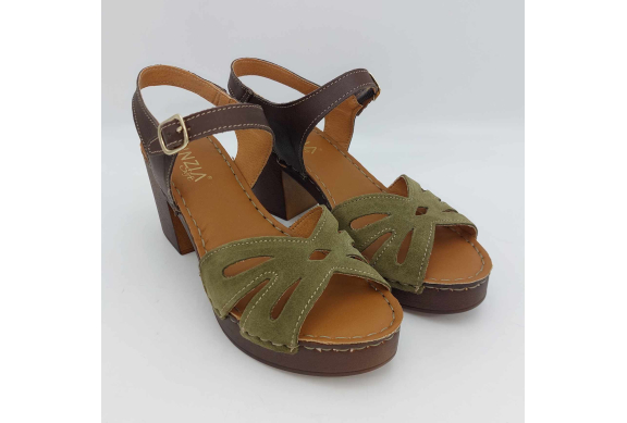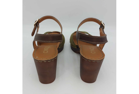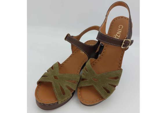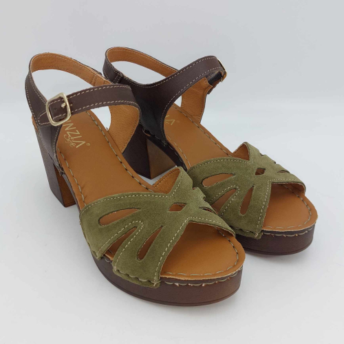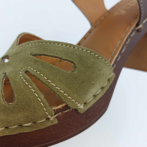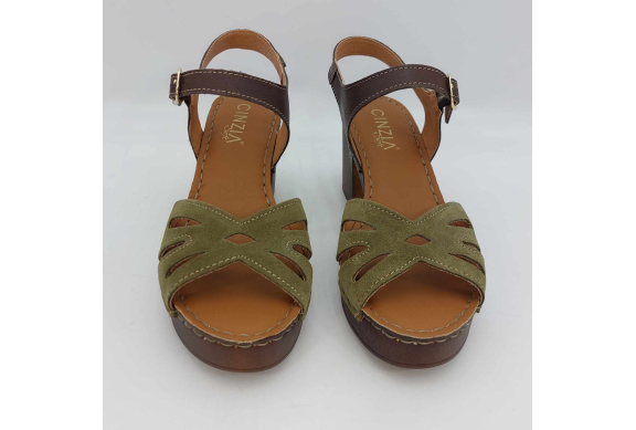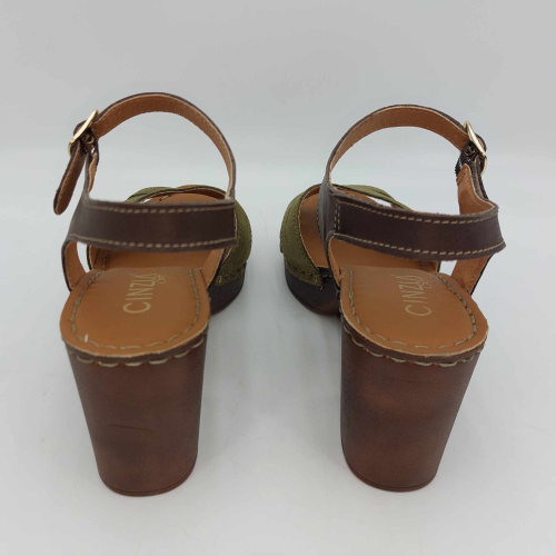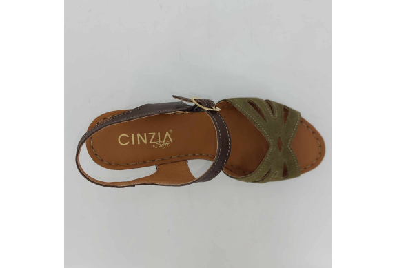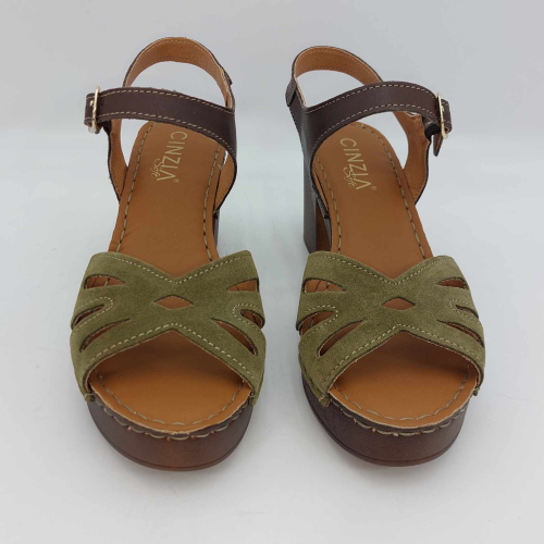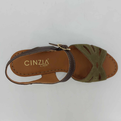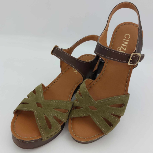 Sandalo Cinzia Soft realizzato in morbido camoscio verde. Cinturino alla caviglia in pelle marrone regolabile con fibbia. Fodera in pelle, sottopiede in pelle morbido e imbottito, suola leggerissima in gomma marrone con tacco grosso 7,5 cm e plateaux 2 cm.