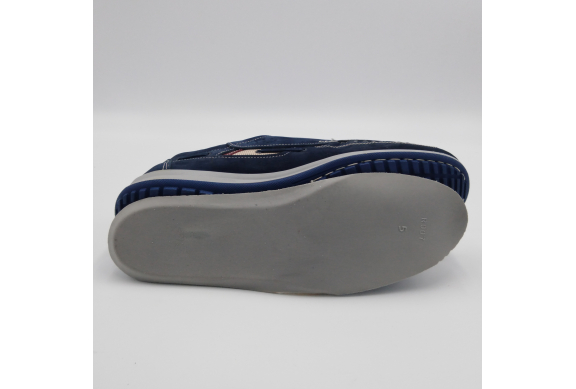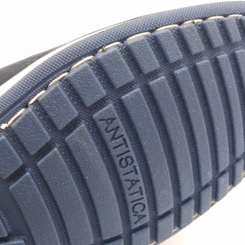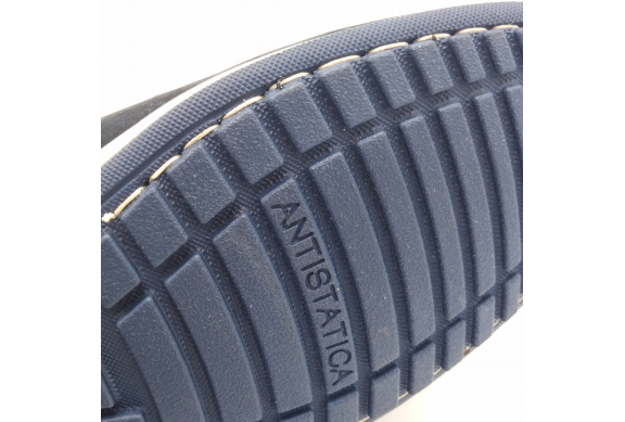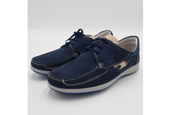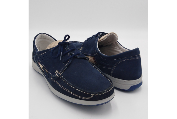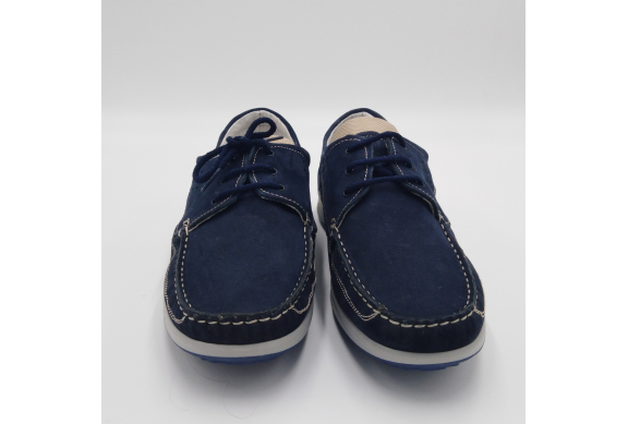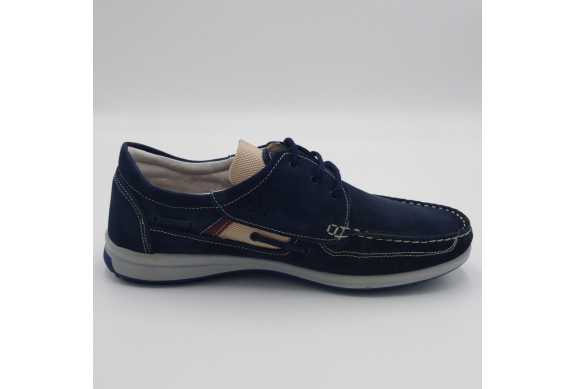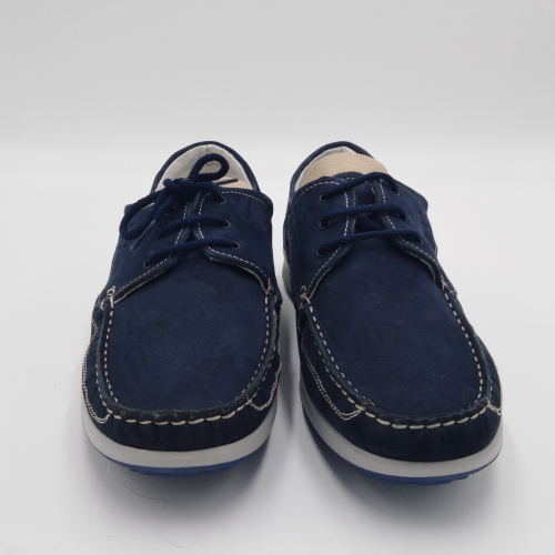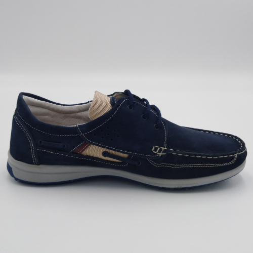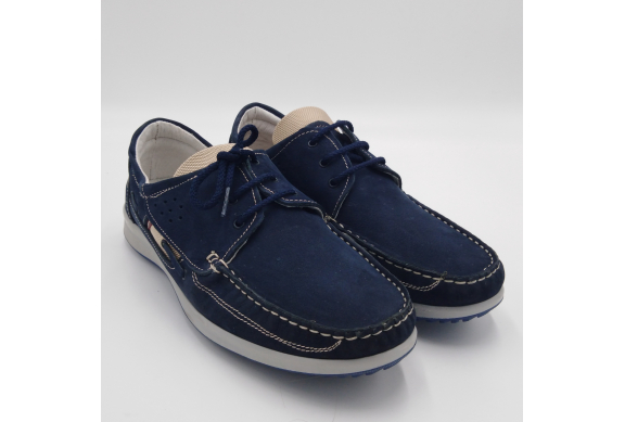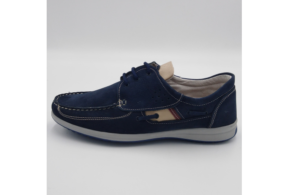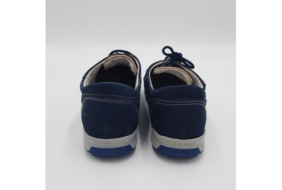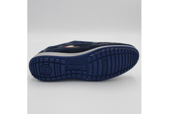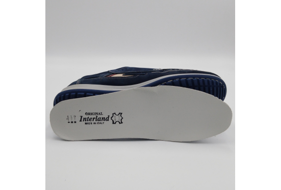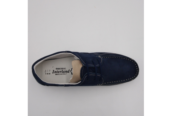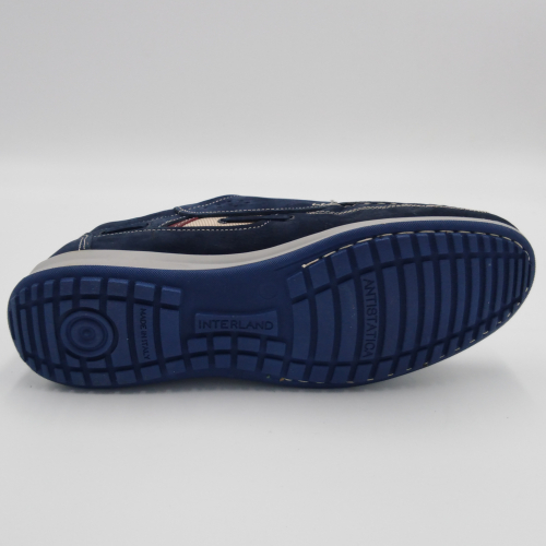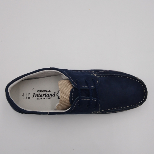 Interland presenta questa scarpa tipo barca con allacciatura tre fori. Tomaia in morbido nabuk blu con inserti in tessuto tecnico e cuciture a vista, fodera e plantare anatomico estraibile in pelle. La suola cucita alla tomaia è in gomma antiscivolo ed antistatica. Calzatura comoda dal design classico e intramontabile che permette di abbinarla a diversi tipi di outfit. Perfetta per la stagione primavera estate. Lavorazione artigianale 100% Made in Italy
