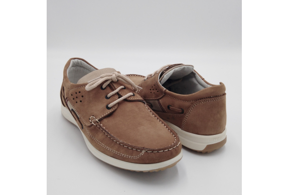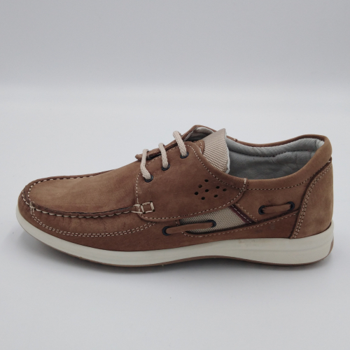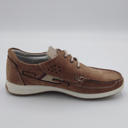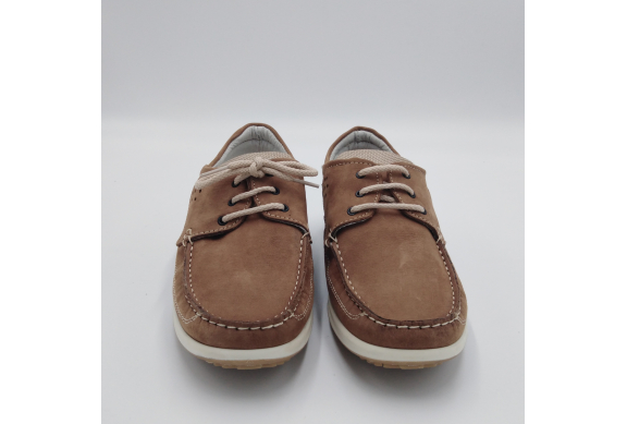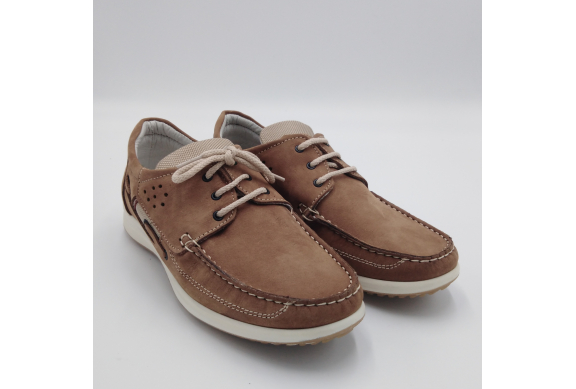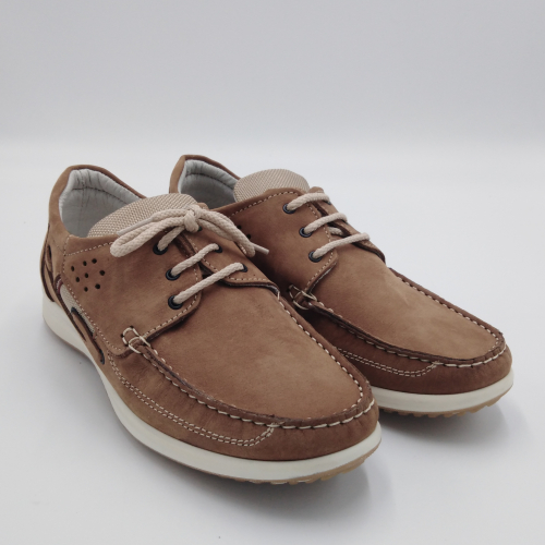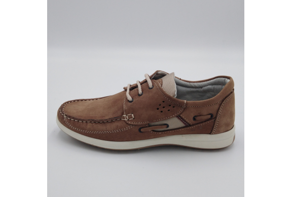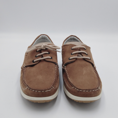 Scarpa allacciata stile barca in morbido e pregiato nabuk, sottopiede anatomico estraibile e fodera in pelle, suola in gomma antistatica ed antiscivolo. Materiali di prima scelta e le linee casual sempre attuali, fanno di questa scarpa la perfetta compagna per la stagione calda. Made in Italy