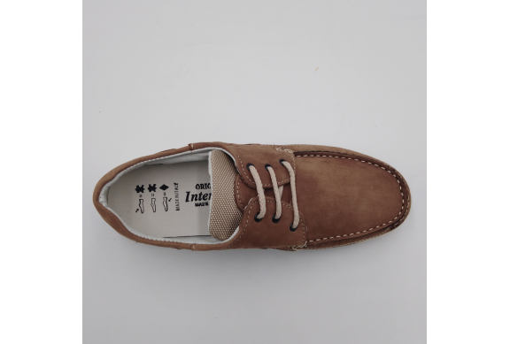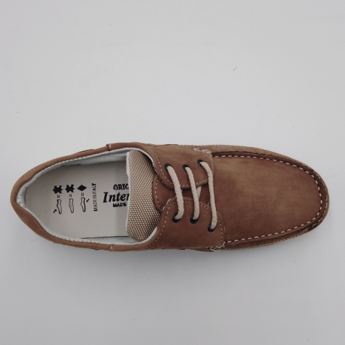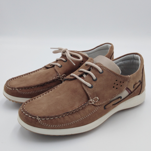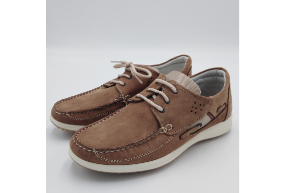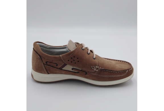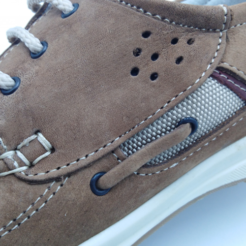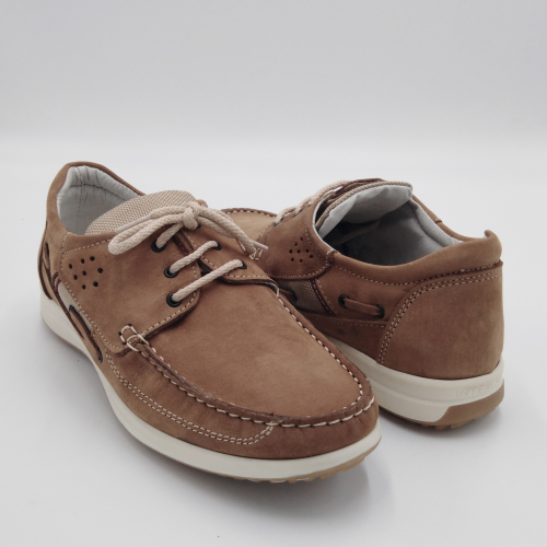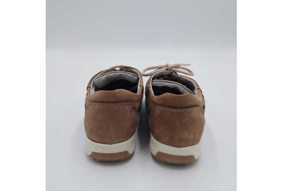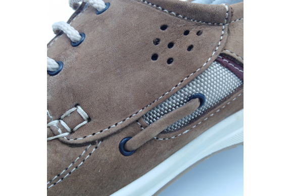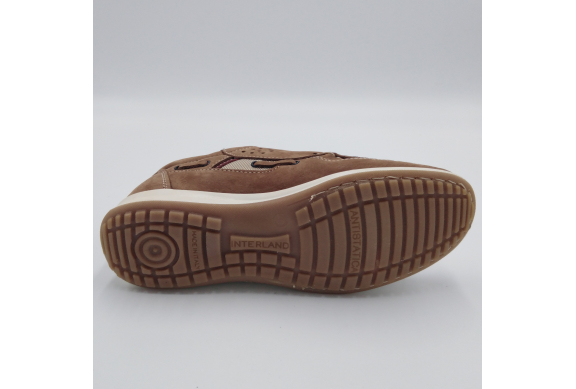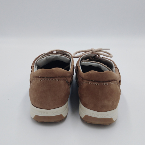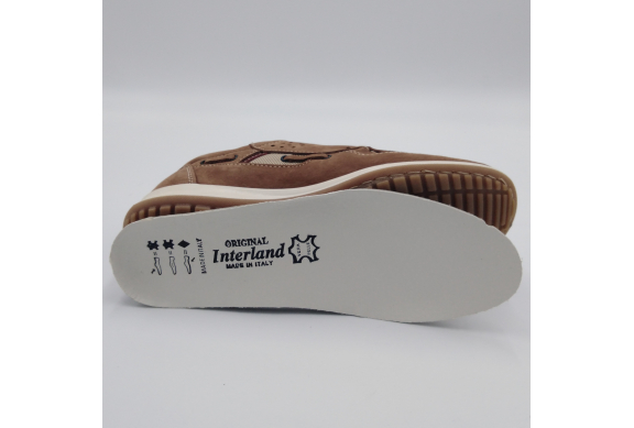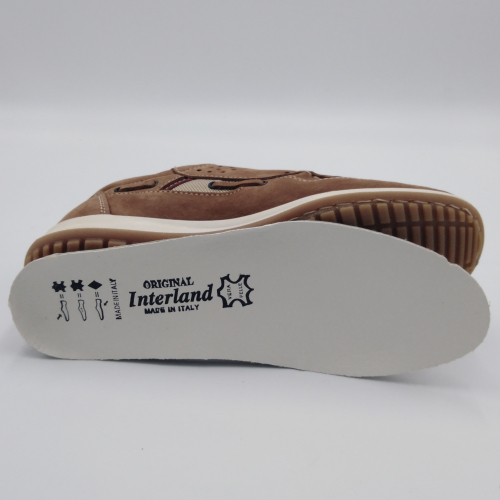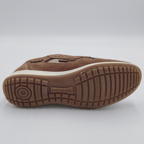Interland presenta questa scarpa tipo barca con allacciatura tre fori. Tomaia in morbido nabuk taupe con inserti in tessuto tecnico e cuciture a vista, fodera e plantare anatomico estraibile in pelle. La suola cucita alla tomaia è in gomma antiscivolo ed antistatica. Calzatura comoda dal design classico e intramontabile che permette di abbinarla a diversi tipi di outfit. Perfetta per la stagione primavera estate. Lavorazione artigianale 100% Made in Italy