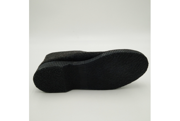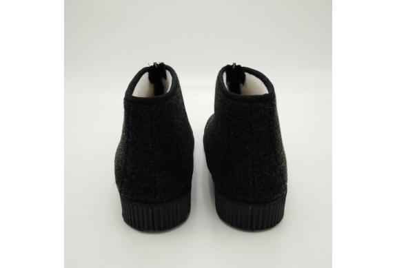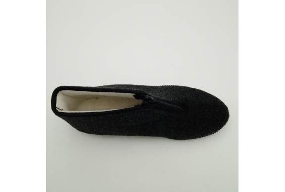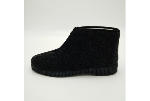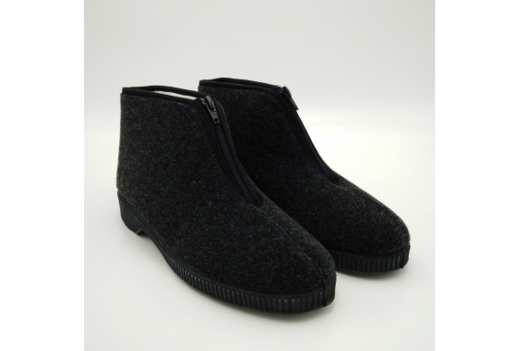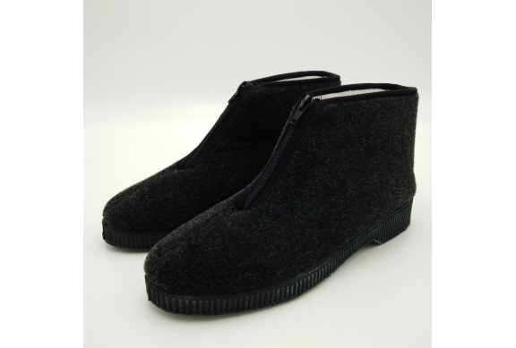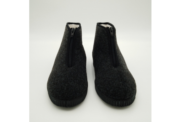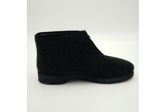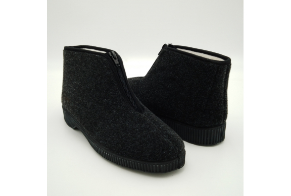 Pantofola  in panno grigio chiusa con cerniera centrale, tomaia in tessuto caldo e fodera lana. Suola in gomma vulcanizzata antiscivolo. Made in Italy