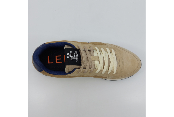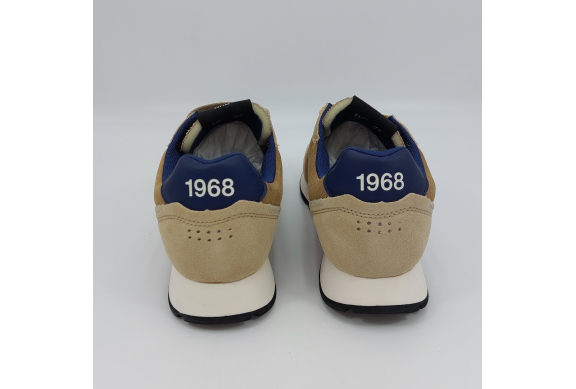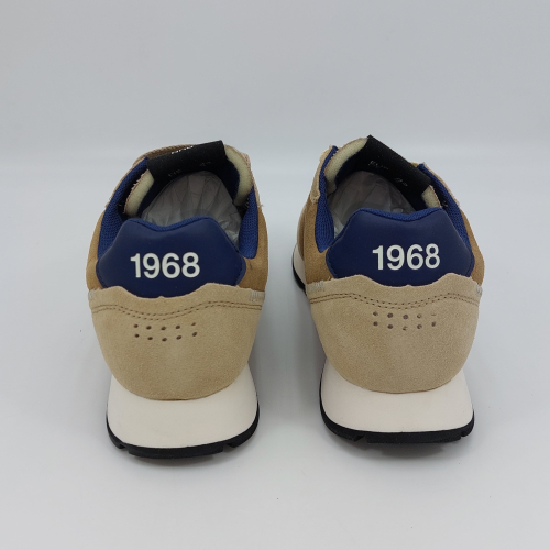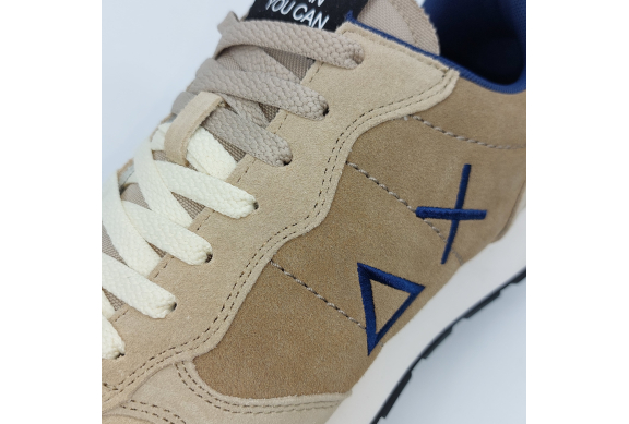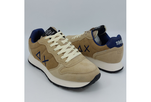 Le Sun 68 Tom Suede sono sneaker sportive realizzate con tomaia in pelle scamosciata beige chiaro e scuro con dettagli blu. Allacciatura sette fori, doppi lacci in dotazione, interno in tessuto con plantare anatomico estraibile alto 1,5 cm. Collarino imbottito, suola in gomma naturale logata, intersuola in eva, patch 1968 sul tallone. Comode e leggere, hanno un design ispirato agli anni '90 e rivisitato in chiave attuale. Sono scarpe che donano comfort al piede e al look una linea moderna.