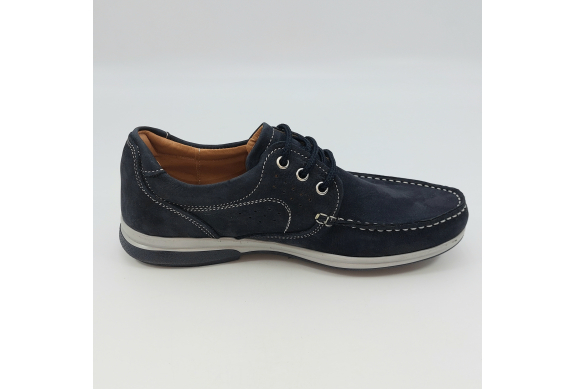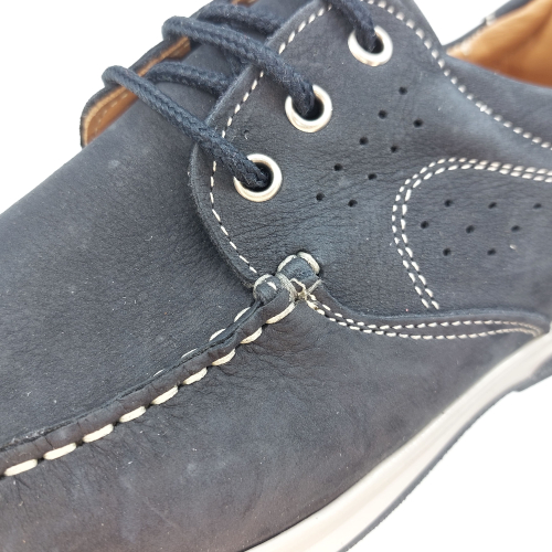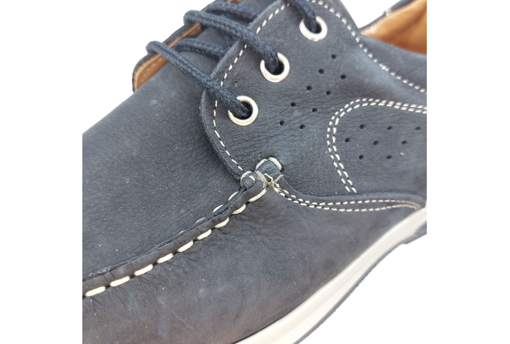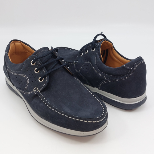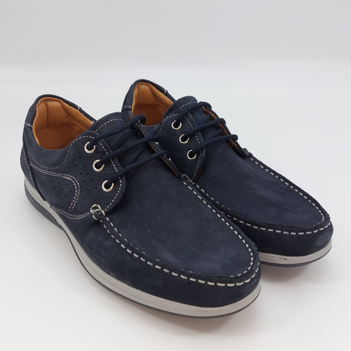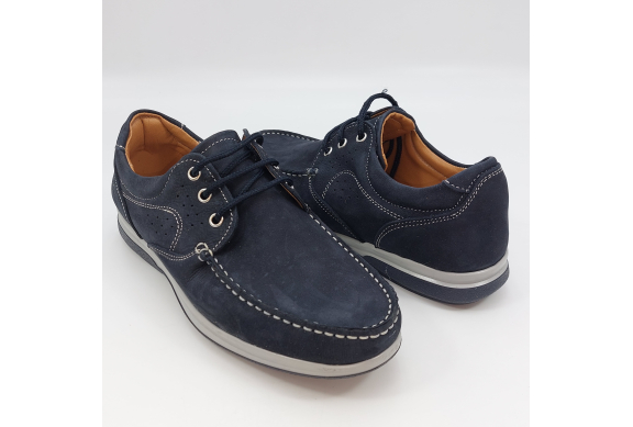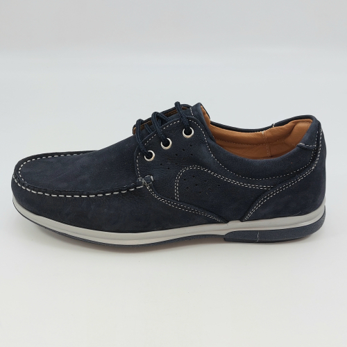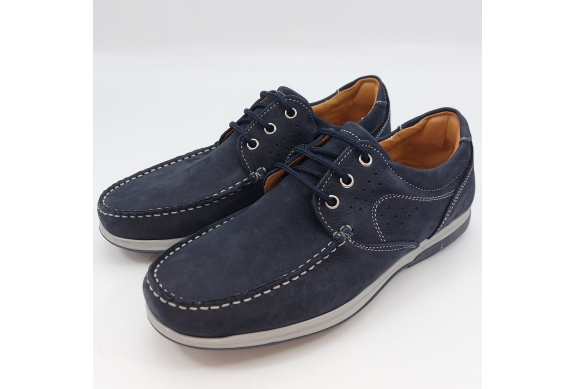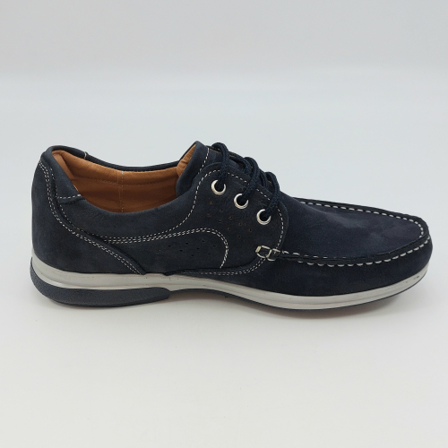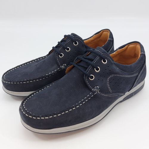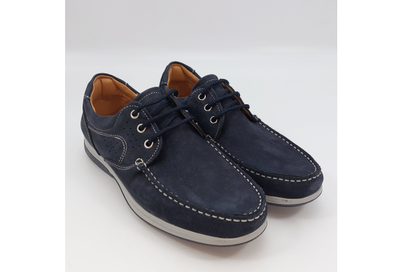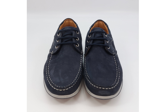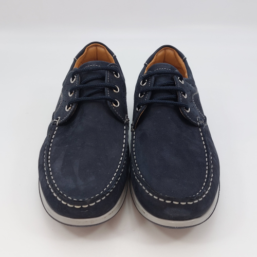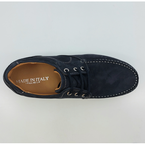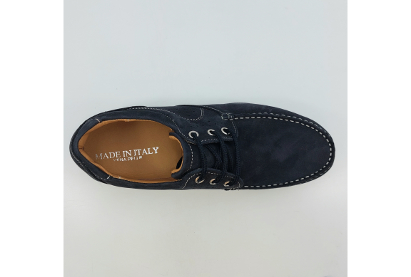 Scarpa tipo barca con allacciatura tre fori. Tomaia in morbido nabuk blu con cuciture a vista, fodera e sottopiede in pelle e tessuto. Suola in gomma leggera, antiscivolo e cucita alla tomaia per una maggiore flessibilità. Calzatura comoda dal design classico e intramontabile che permette di abbinarla a diversi tipi di outfit. Perfetta per la stagione primavera estate. Lavorazione artigianale 100% Made in Italy