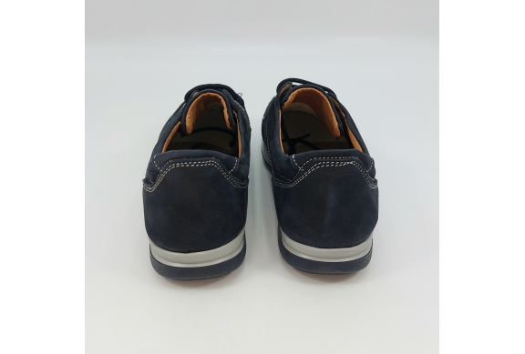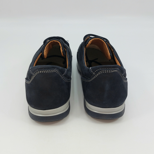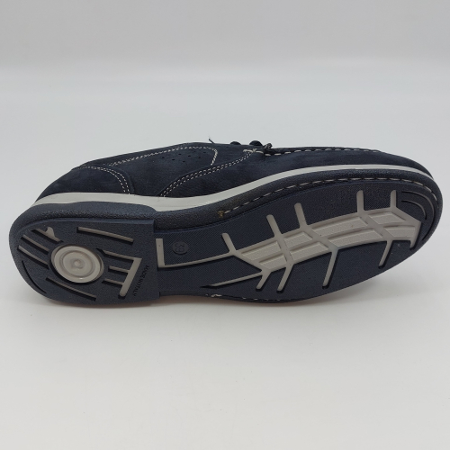 Scarpa comoda in morbido tessuto e nabuk navy, suola in gomma ultraleggera, plantare anatomico in tessuto.