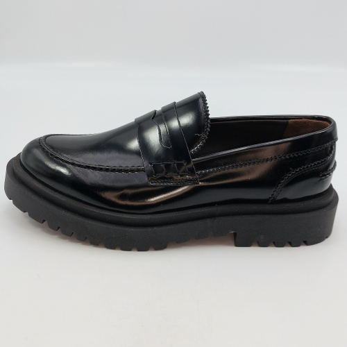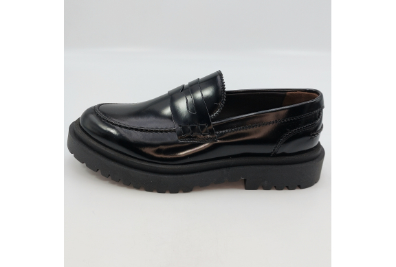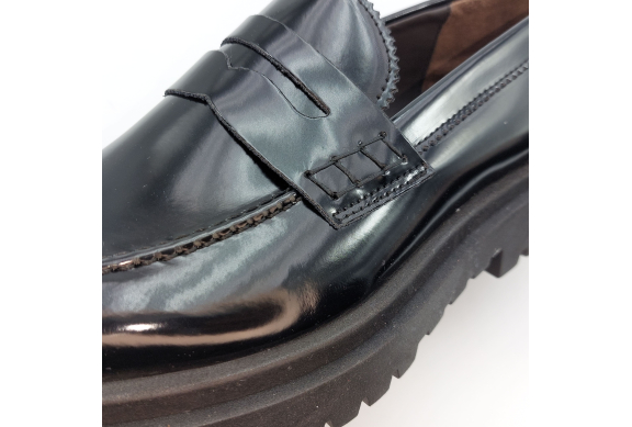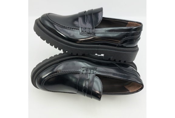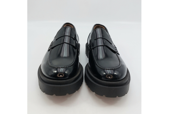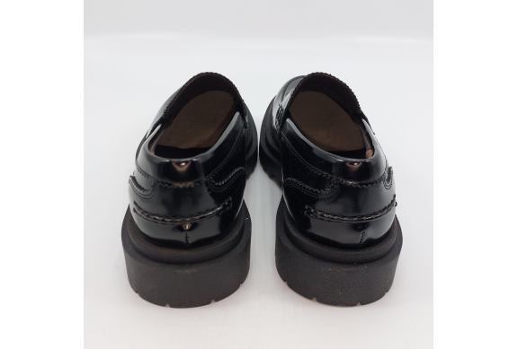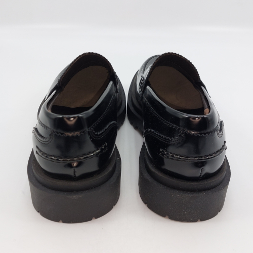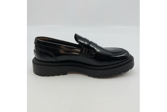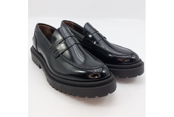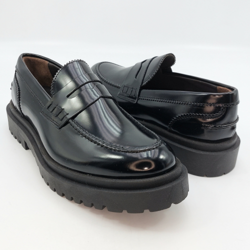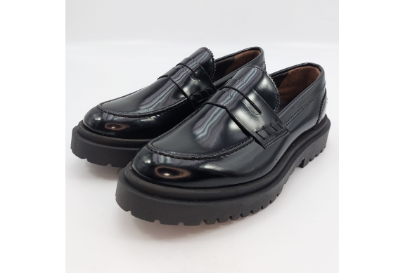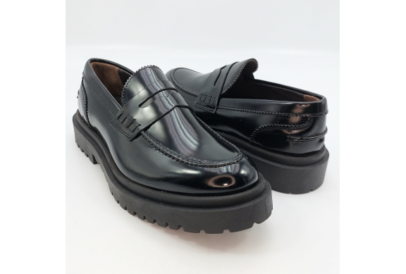 Mocassino uomo tipo college con passante, rivisitato in chiave trendy. Realizzato in pelle spazzolata nera. Fodera in pelle, voluminosa suola in gomma carrarmato e tacco 4 cm. Lavorazione artigianale completamente fatta in Italia.