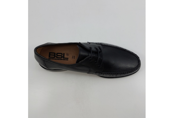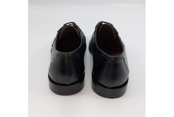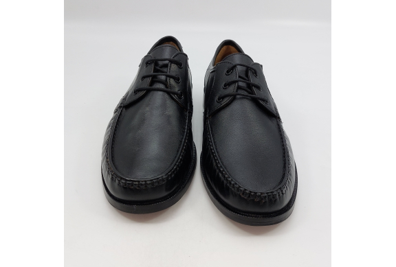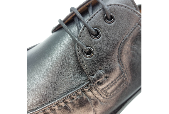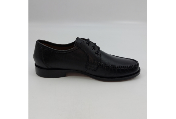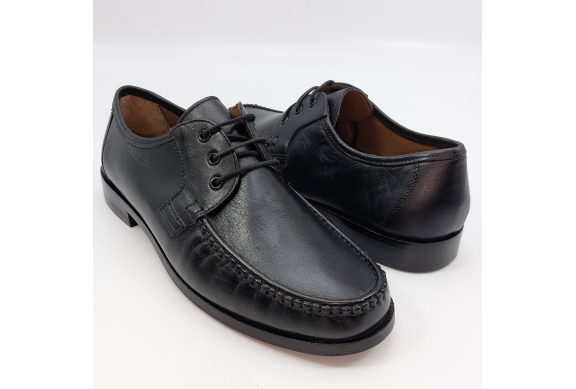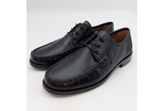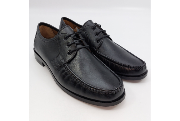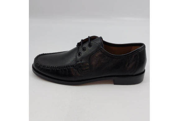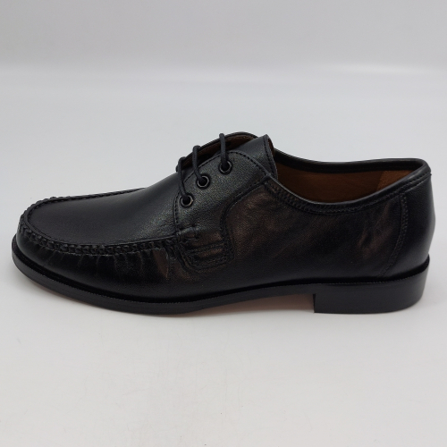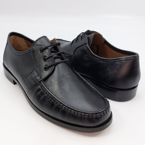 Scarpa da uomo tipo mocassino con allacciatura tre fori per una calzata e regolazione perfetta. Tomaia in morbida pelle nera. Fodera pelle, suola Vero Cuoio con inserto antiscivolo e tacco 2,5 cm.