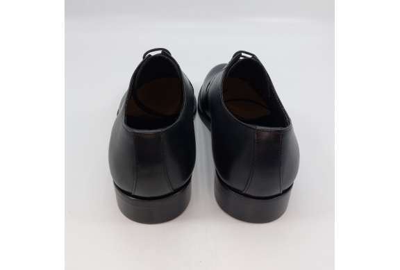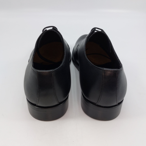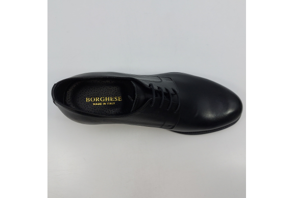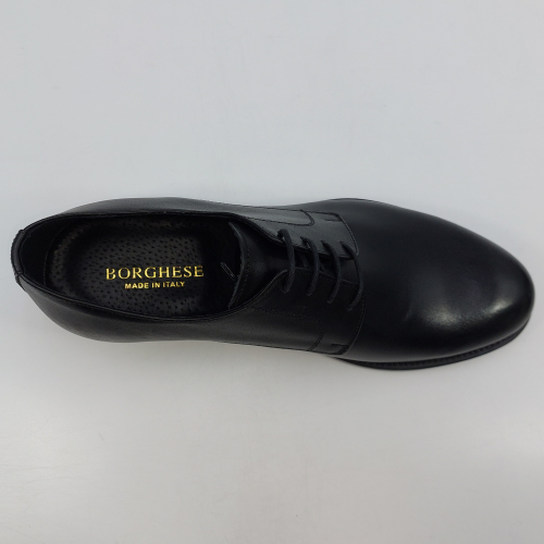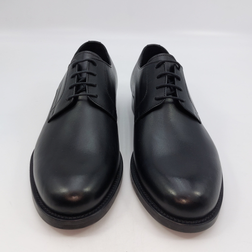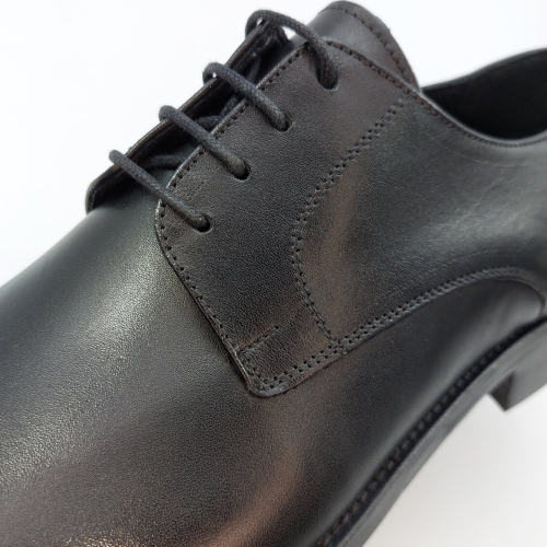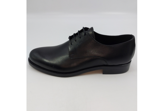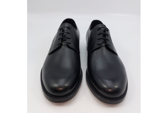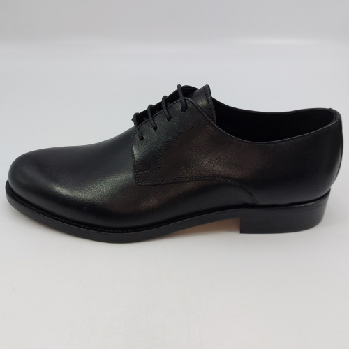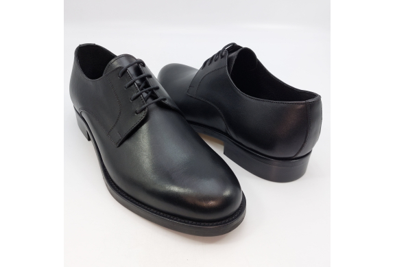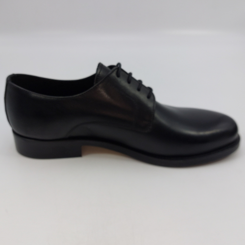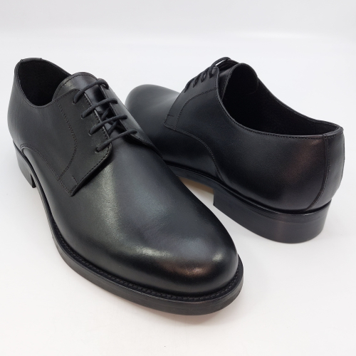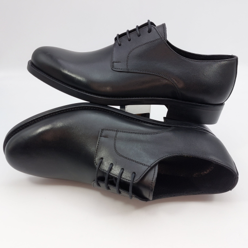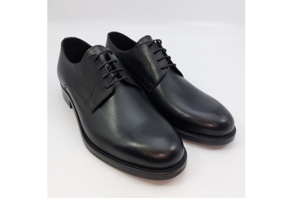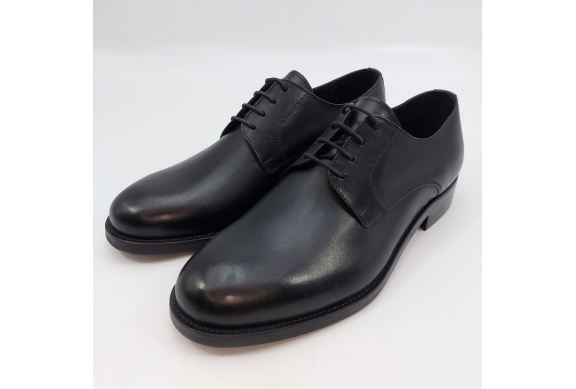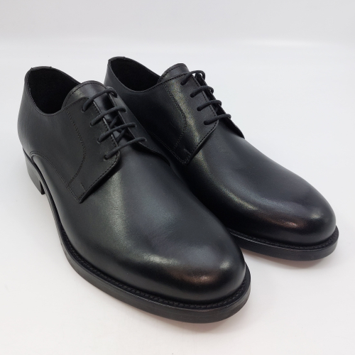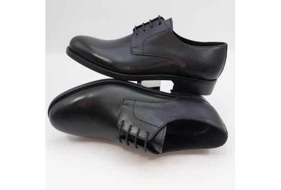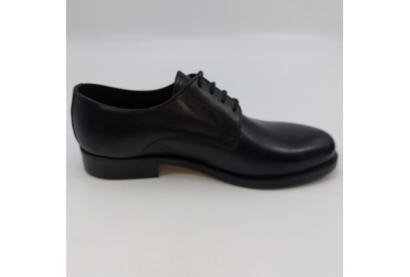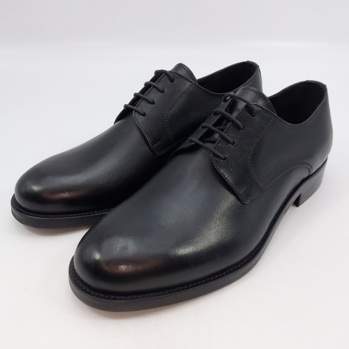 Scarpa da uomo tipo derby liscio, allacciatura quattro fori per una calzata e regolazione perfetta. Tomaia in pelle di vitello nera. Fodera in pelle, suola in Vero Cuoio con inserto antiscivolo e tacco 3 cm. Lavorazione artigianale accurata e completamente fatta in Italia.