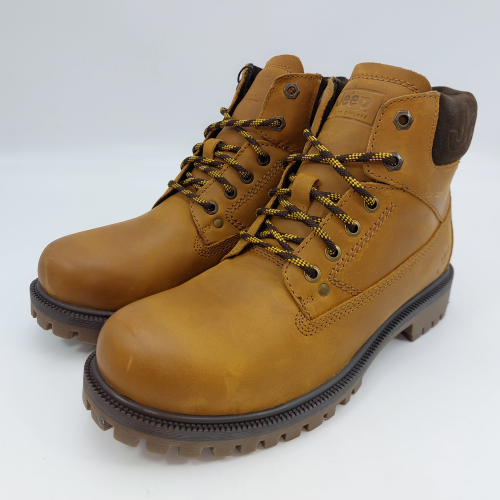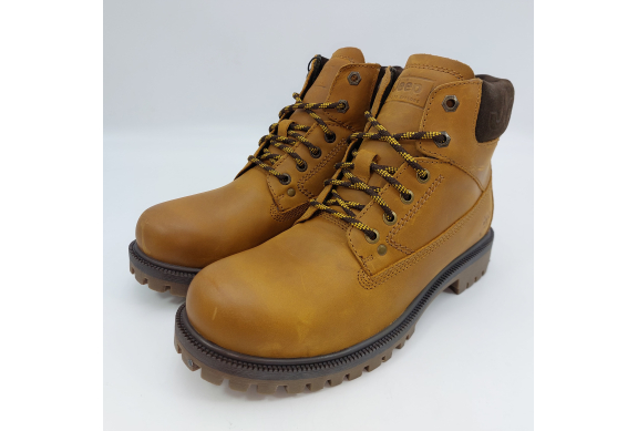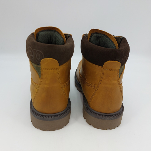 Scarponcino in nabuk ingrassato giallo scuro, collarino imbottito in camoscio logato, cuciture a vista. Allacciatura sei fori, fodera e sottopiede in tessuto, suola in gomma carrarmato.