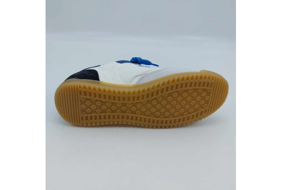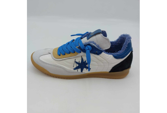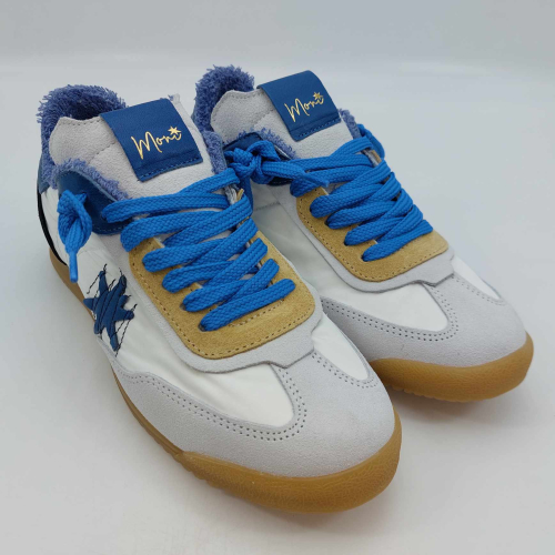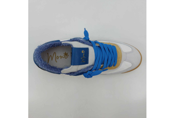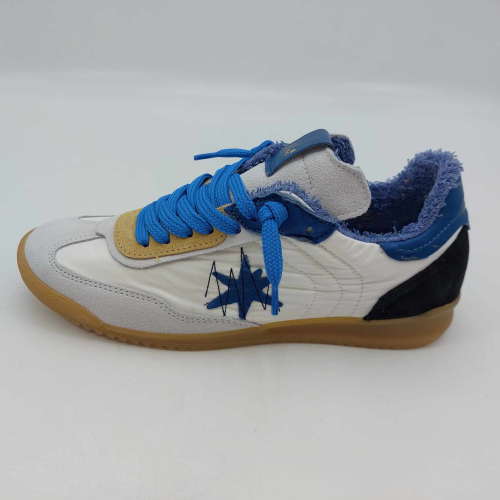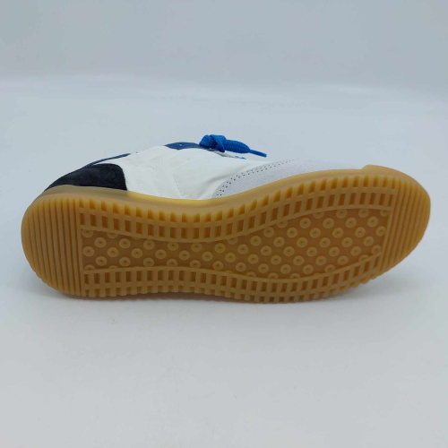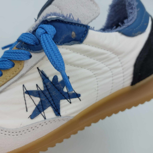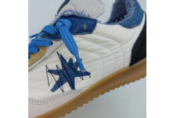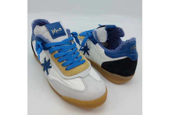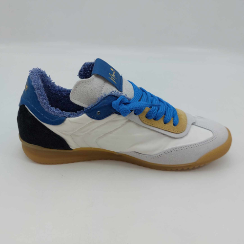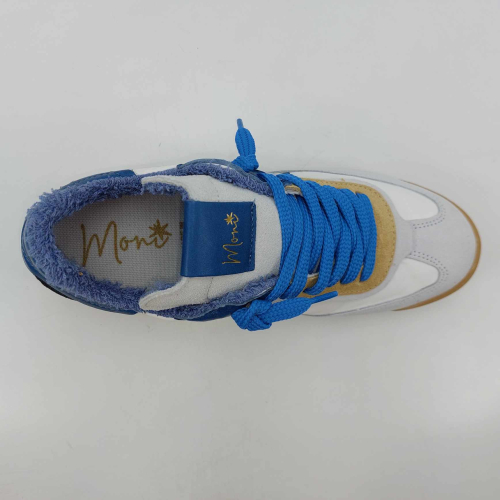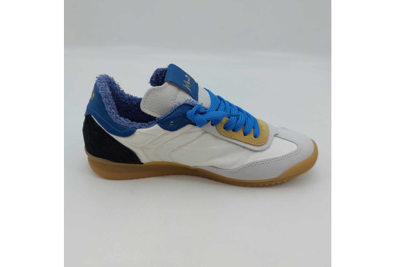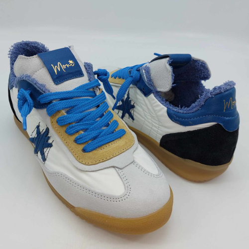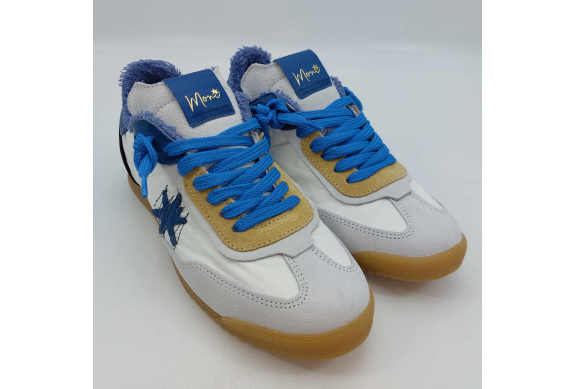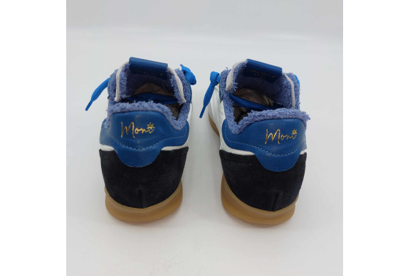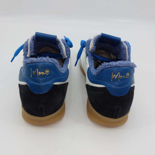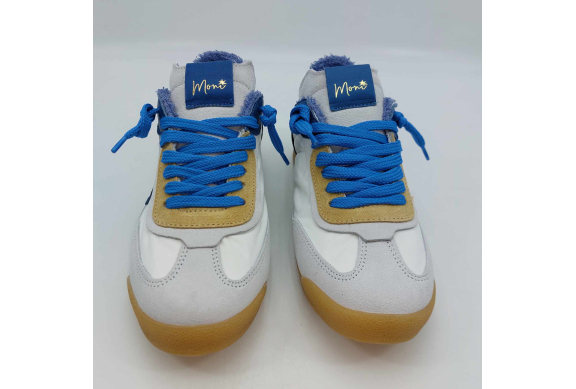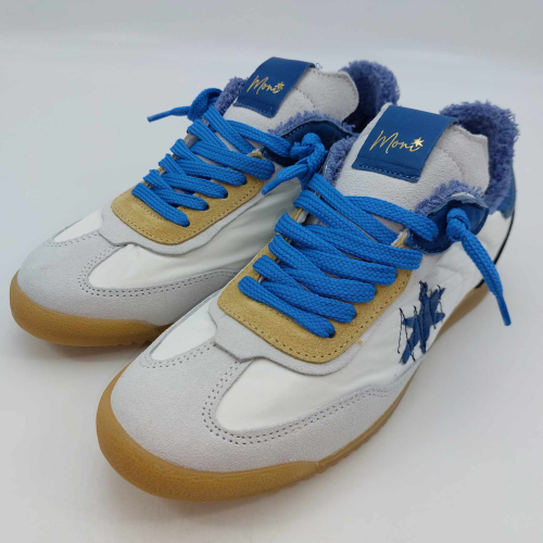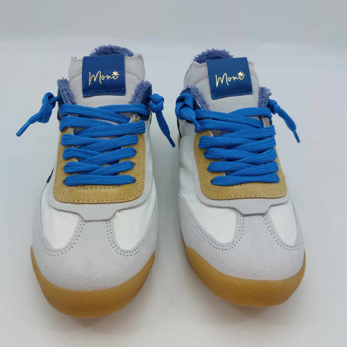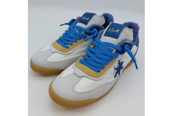 Le Monì Lov&Laf sono sneaker sportive realizzate con tomaia in pelle scamosciata, nylon bianco e dettagli navy, allacciatura sette fori. Fodera in spugna di cotone e plantare anatomico estraibile in tessuto alto 1,5 cm. Suola in gomma naturale color miele alta 2,5 cm, patch blue sul tallone. Comode, leggere e flessibili, hanno un design ispirato agli anni '90 e rivisitato in chiave attuale. Sono scarpe che donano comfort al piede e al look una linea trendy.