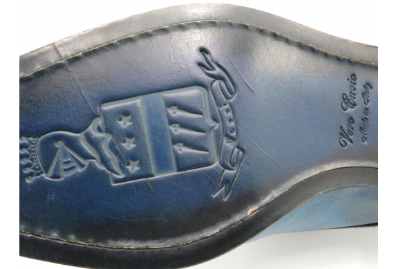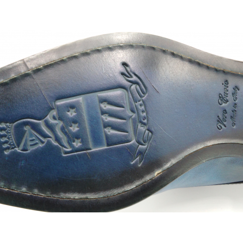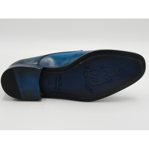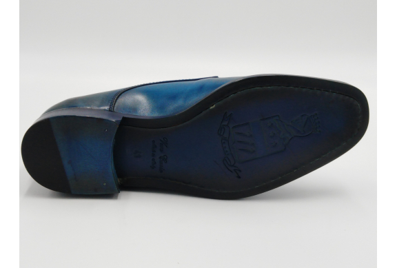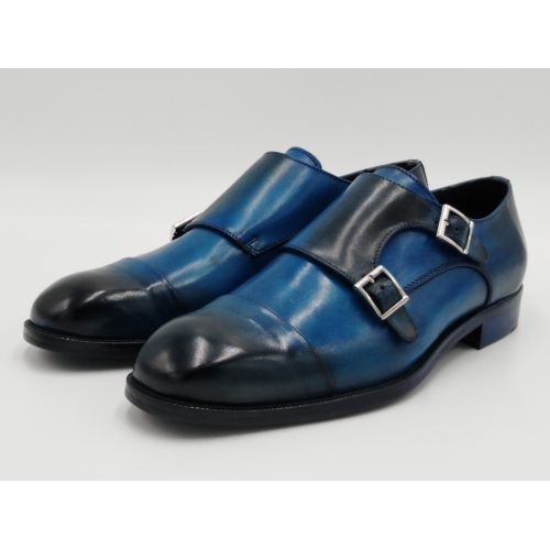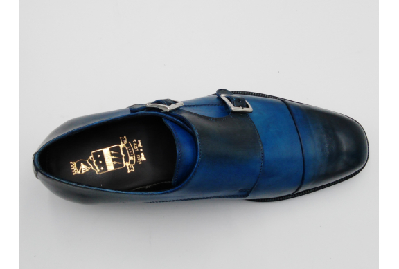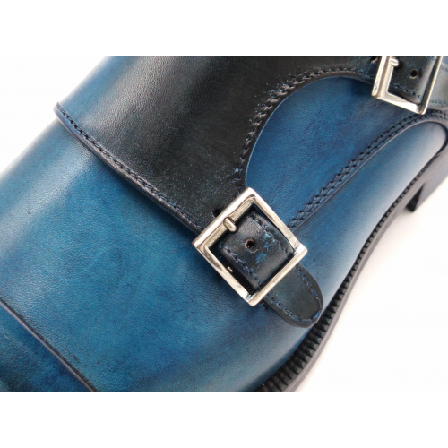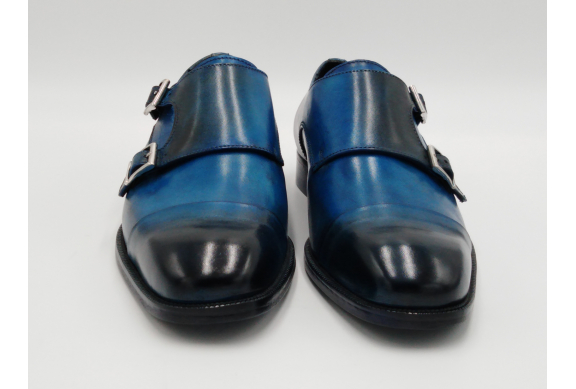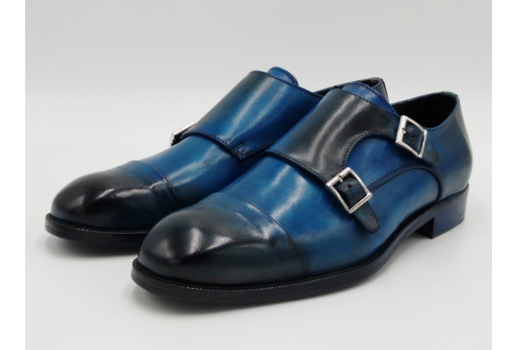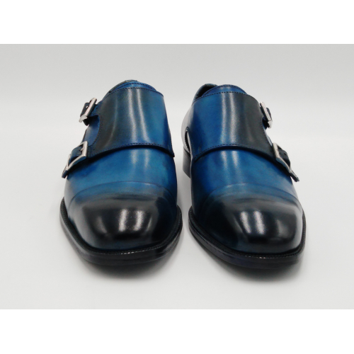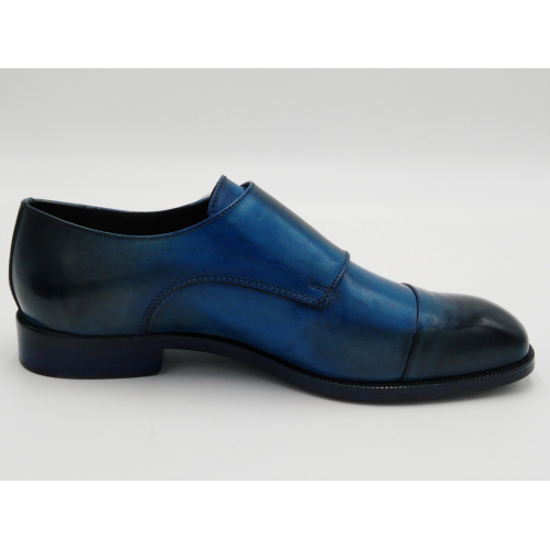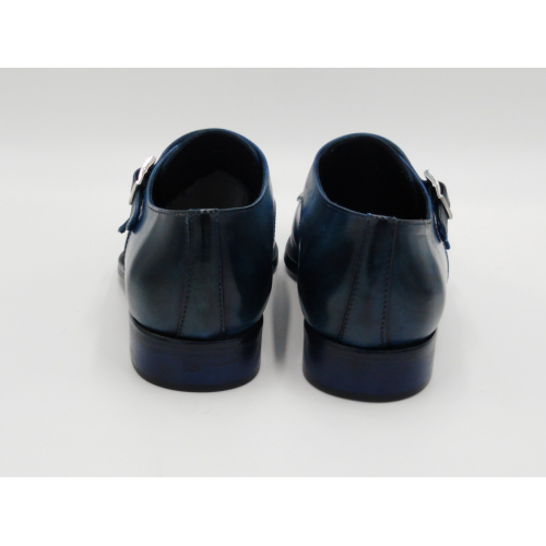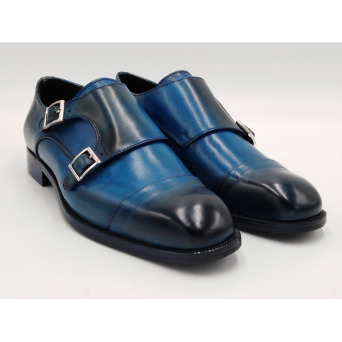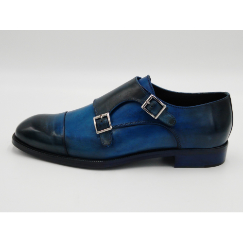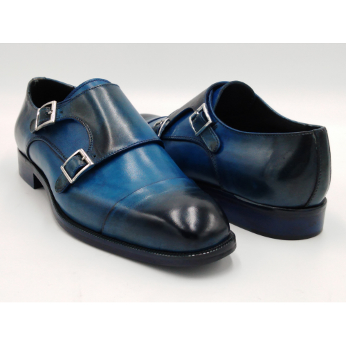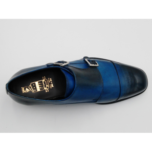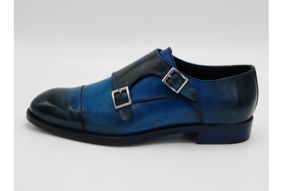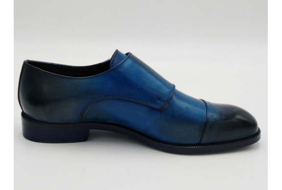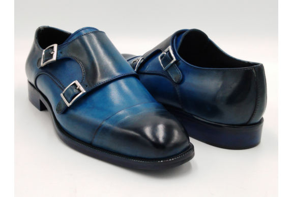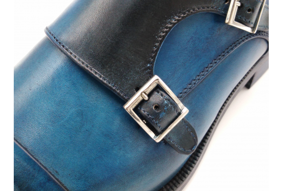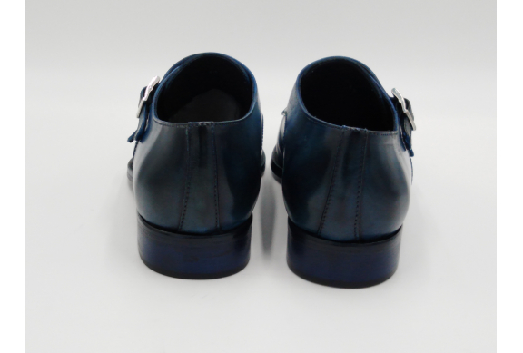 Scarpa da uomo modello con doppia fibbia, tomaia in pelle colore blu, sfumata su punta e tallone con pregiate cere nere. Fodera e soletta interna in pelle, montata con lavorazione a sacchetto "Bologna". Suola in Vero Cuoio cucita a mano alla tomaia. Lavorazione artigianale completamente fatta in Italia.