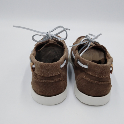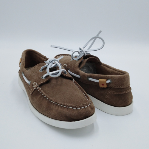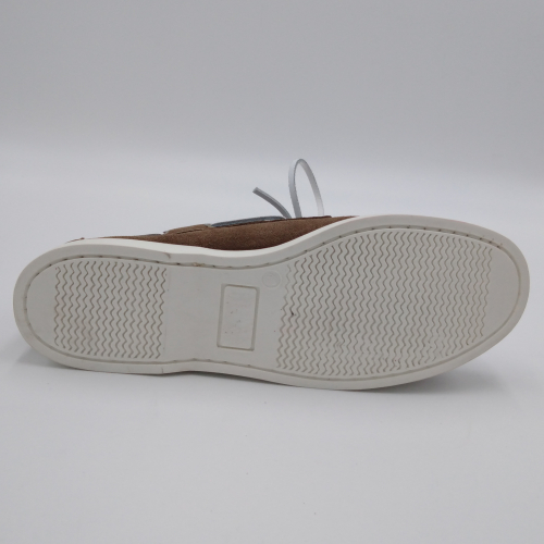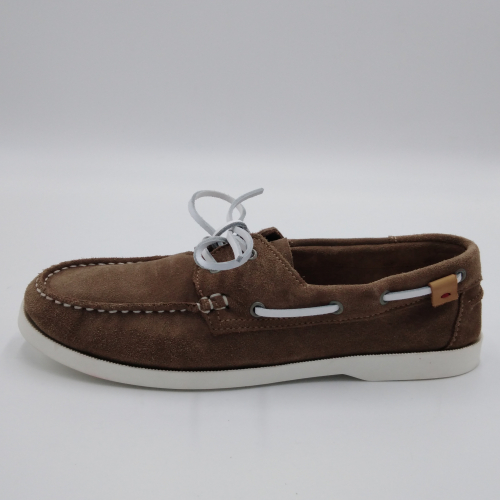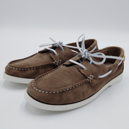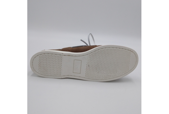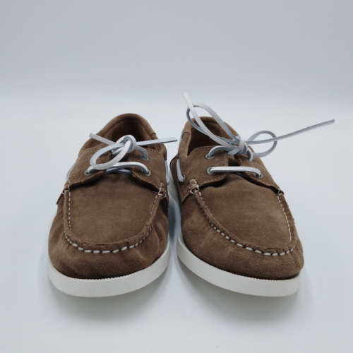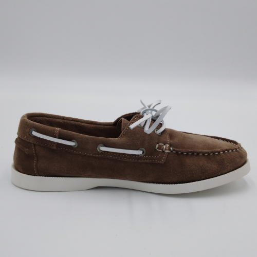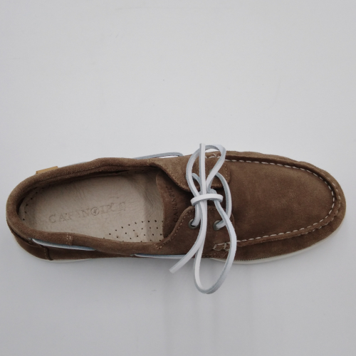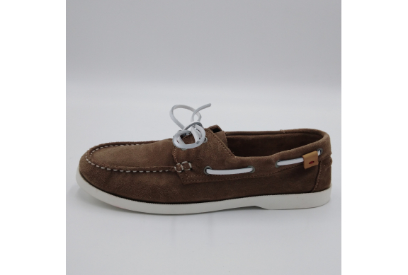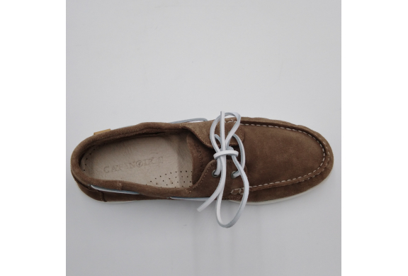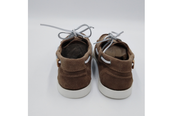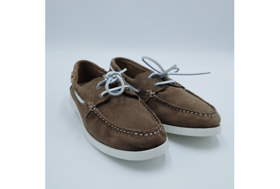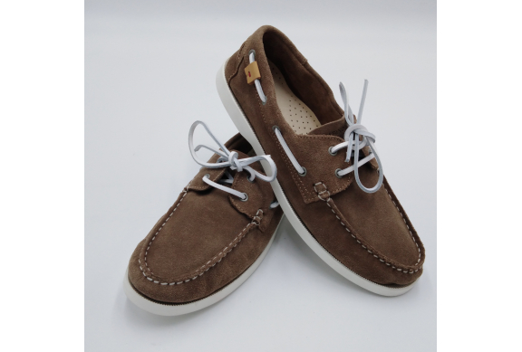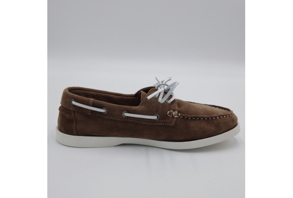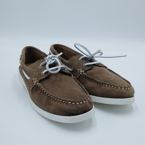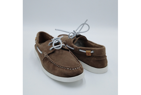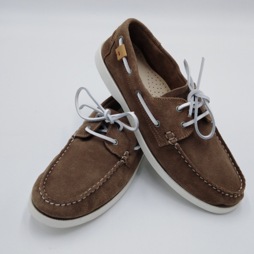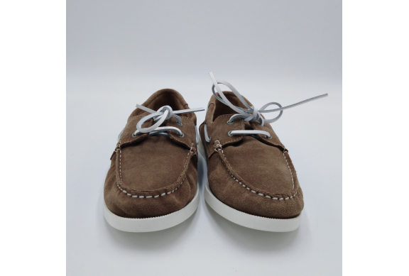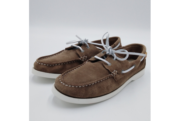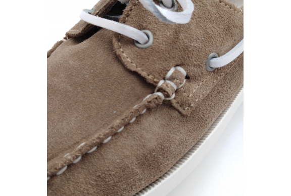 Il TG 601 di Cafè Noir è un mocassino boat shoes in morbido camoscio taupe, completamente sfoderato con sottopiede in pelle. Chiusura con lacci in pelle e passanti ad anello in metallo. La suola è in gomma bianca, antiscivolo, flessibile, leggera e cucita alla tomaia. Hanno un design classico che permette di abbinarle a diversi tipi di outfit, perfette per la stagione calda.