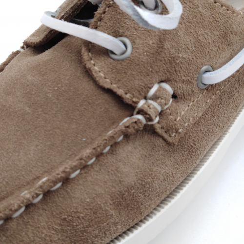 Mocassino da barca stringato in pelle scamosciata beige. Scarpa nautica dallo stile intramontabile con suola in gomma flessibile e leggera. Sottopiede e lacci in pelle.